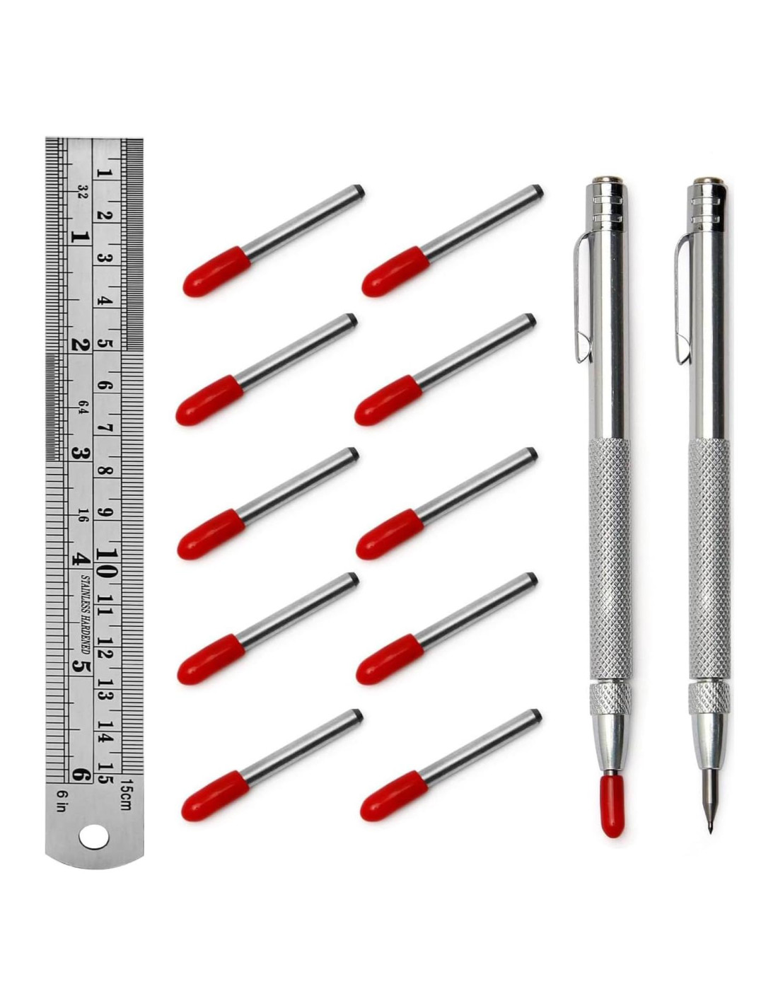 - Contenido del paquete - Recibirás 2 bolígrafos de marcado de carburo magnético fuertes con regla de acero inoxidable de 15cm y 10 puntas de marcador de repuesto, cada una con una tapa protectora. Suficientes para satisfacer tus necesidades diarias y de reemplazo, y puedes ahorrar dinero simplemente reemplazando las puntas desgastadas.