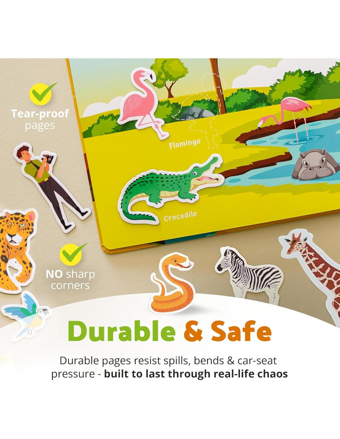 - Diversión Magnética Sin Desorden - Sin Velcro: No más desorden pegajoso, sujetadores débiles o velcro que no funciona. Las páginas magnéticas dan a los niños total libertad para colocar animales donde su imaginación los lleve.