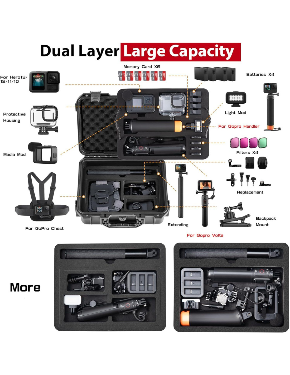 - Almacenamiento de Gran Capacidad: La capa superior sostiene para GoPro 13 (con media mod), carcasa protectora, 4 baterías, 4 filtros, varilla de flotación, mod de luz, volta o 3-way 2.0, manejador, trípode corto, palo de selfie corto. La capa inferior es personalizable para soporte de pecho de gopro, varillas de extensión, palos de selfie, cargador de batería dual y otros accesorios con soporte removible para ajustes de bricolaje.