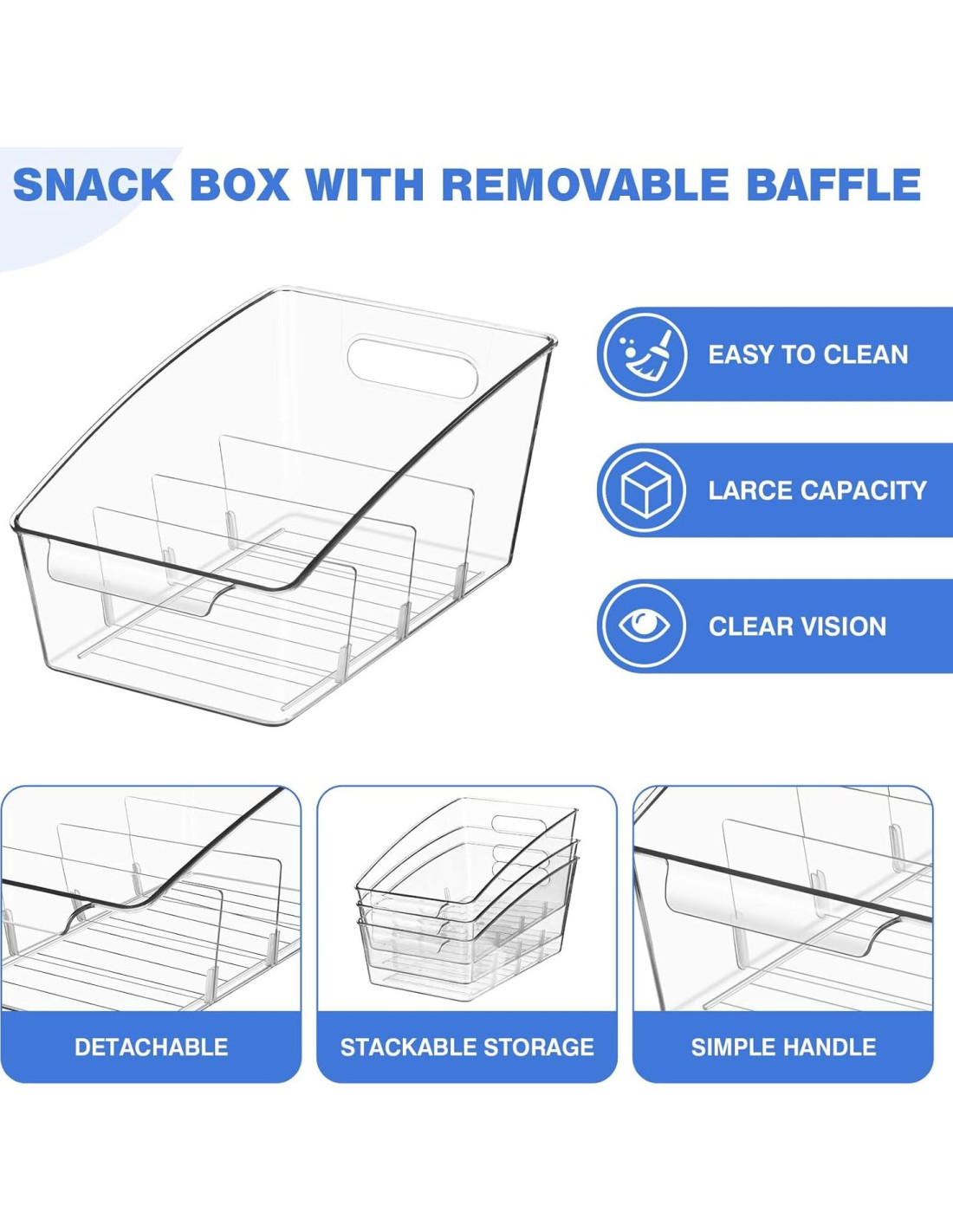 - Divisores Removibles: Hay 3 divisores removibles en cada bin de almacenamiento de alimentos, lo que facilita separar y organizar sus artículos, puede ver y tomar rápidamente lo que necesita. Los bins organizadores de despensa serán una buena opción como bins organizadores para almacenar y organizar medicamentos, snacks, paquetes de especias, paquetes de condimentos, paquetes de té, paquetes de comida instantánea.