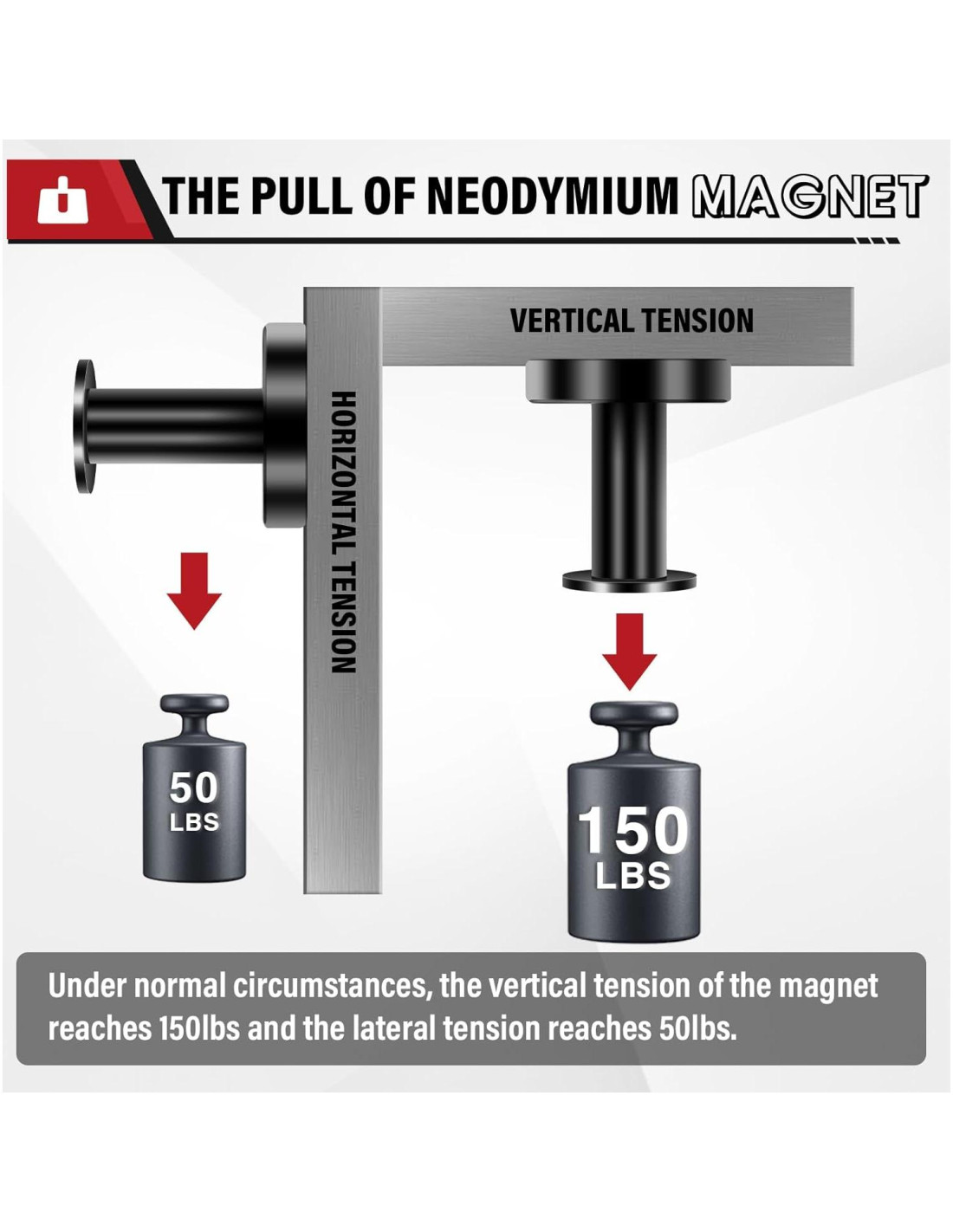 - GANCHOS MAGNÉTICOS FUERTES Este gancho magnético para colgar puede soportar hasta 150 libras (68.18 kg) en suspensión vertical y hasta 50 libras (22.68 kg) en suspensión horizontal. El valor de tensión que proporcionamos es el valor de tensión ideal máximo medido por la máquina, y el valor de tensión real que se puede lograr en uso está relacionado con el material y el grosor en contacto.