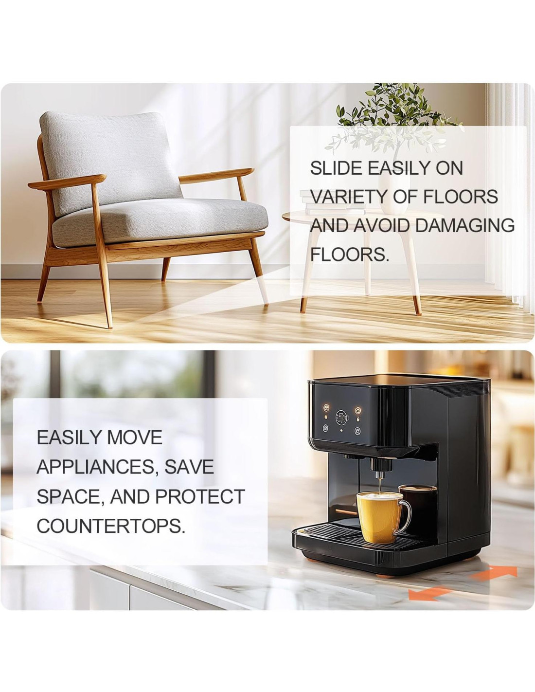 - [Uso Versátil] Ampliamente utilizados en varios muebles como sillas, armarios, sofás, camas, etc. Además de los usos en muebles, también facilitan el movimiento de electrodomésticos de cocina como freidoras de aire, máquinas de café, batidoras de pie y hornos sin dañar las encimeras.