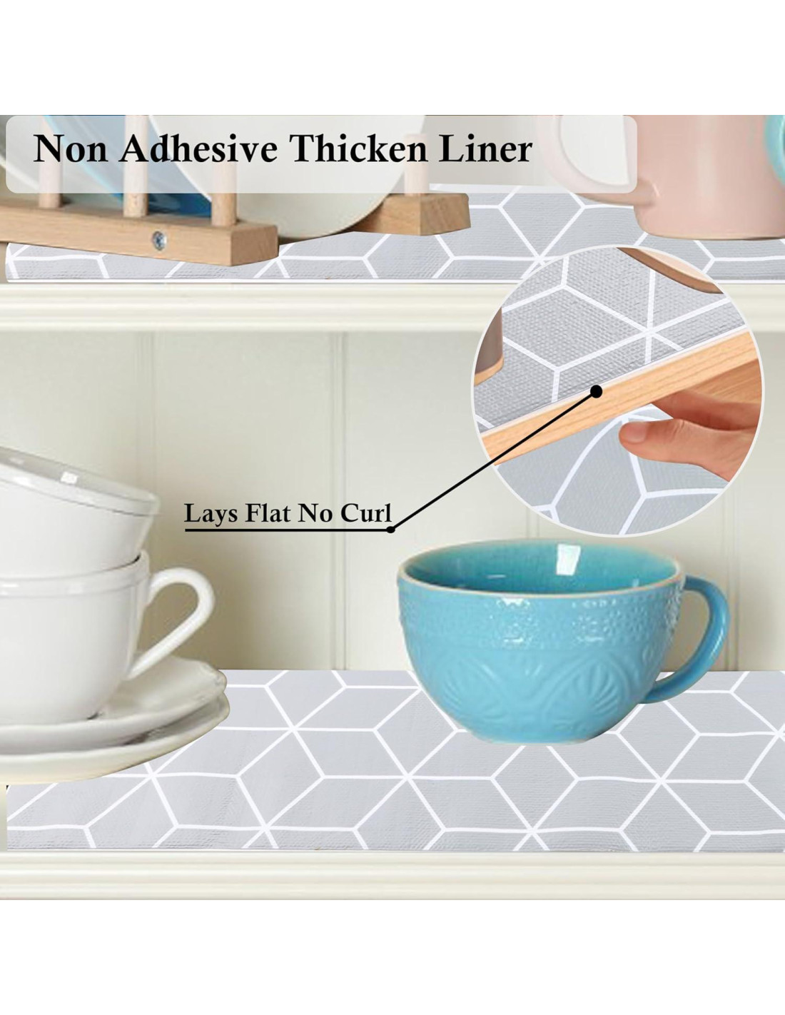 - MATERIAL APTO PARA ALIMENTOS - Los forros de estante para gabinetes de cocina están hechos de material de alta calidad apto para alimentos, libre de BPA, no tóxico, sin olor químico. Las líneas geométricas de la superficie son más tridimensionales, diseño moderno y simple que combina perfectamente con tu hogar