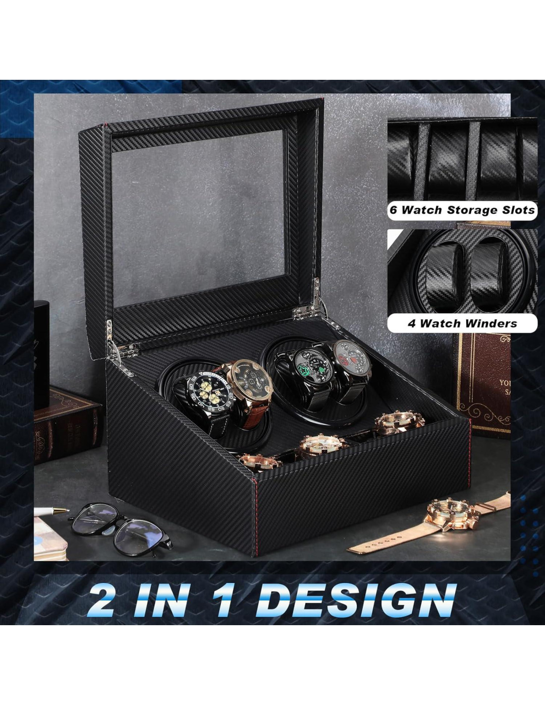 - Buenos Materiales: recibe una caja enrolladora de relojes con 4 posiciones para girar el reloj y 6 compartimentos para almacenar relojes, el enrollador automático de relojes viene con un enchufe, la capa exterior del enrollador de relojes está hecha de cuero PU de fibra de carbono, la capa interior es de lujosa gamuza artificial, el color clásico y elegante deja una impresión de alta gama