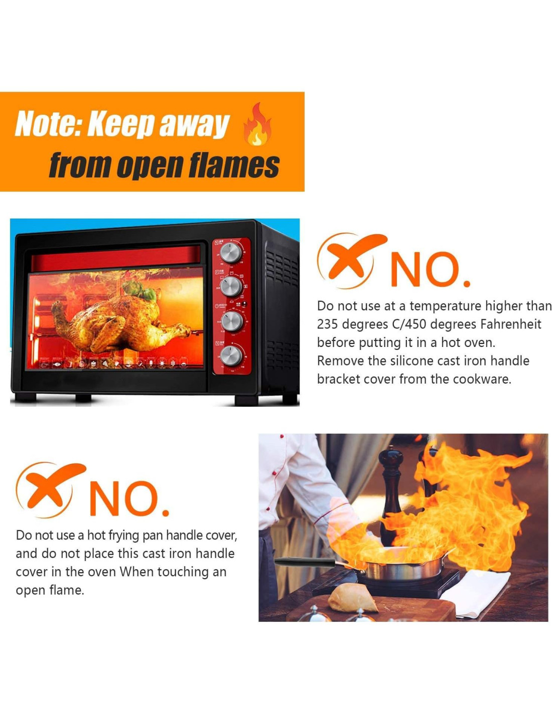 - Nota: NO use la cubierta del mango de la sartén caliente cuando esté en contacto con llamas abiertas, no coloque esta cubierta de mango de hierro fundido mientras esté en el horno. La cubierta del soporte de mango de hierro fundido de silicona debe ser retirada de la olla antes de colocarla en el horno caliente. No usar a temperaturas superiores a 235 grados C (450 grados F).