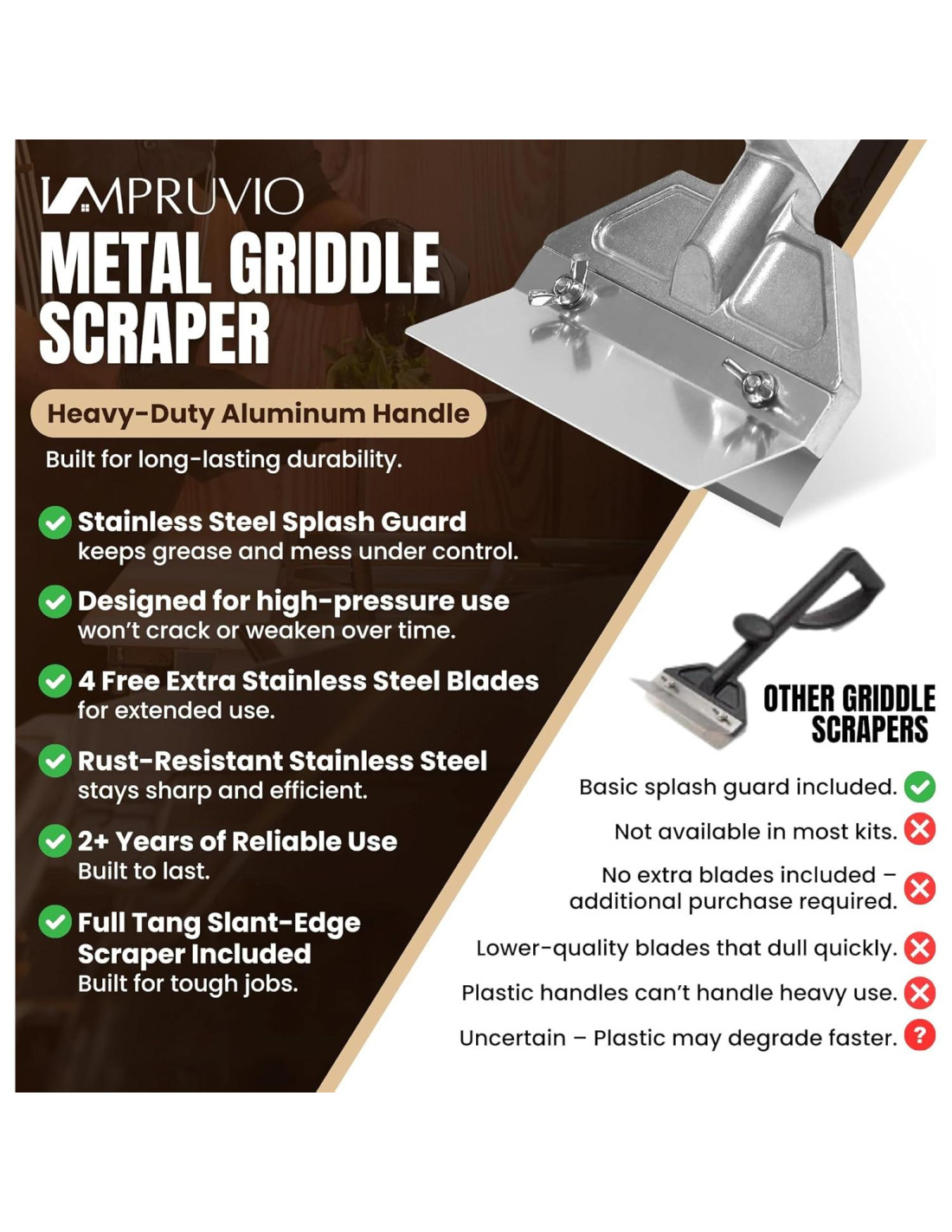 - JUEGO DE LIMPIEZA COMPLETO - Incluye un raspador de plancha, un raspador pequeño de bisel y 4 cuchillas de repuesto, por lo que siempre estás listo para enfrentar grasa y suciedad pegadas.