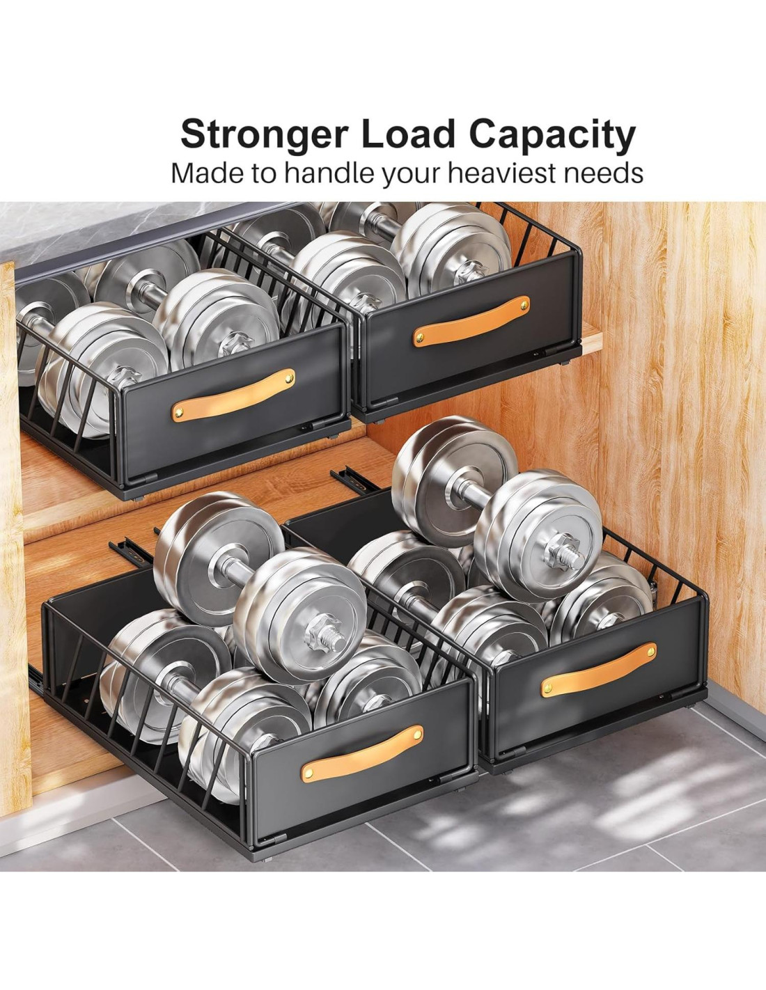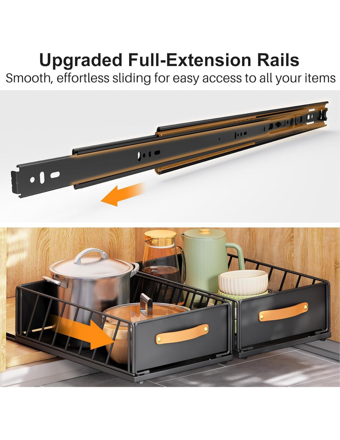 - Fuerte Capacidad de Carga. Nuestros estantes de gabinete deslizantes extraíbles están hechos de acero al carbono premium con un acabado en polvo negro. La construcción robusta de este organizador de gabinete deslizante proporcionará una fuerte capacidad de carga para contener y organizar artículos sueltos fácilmente
