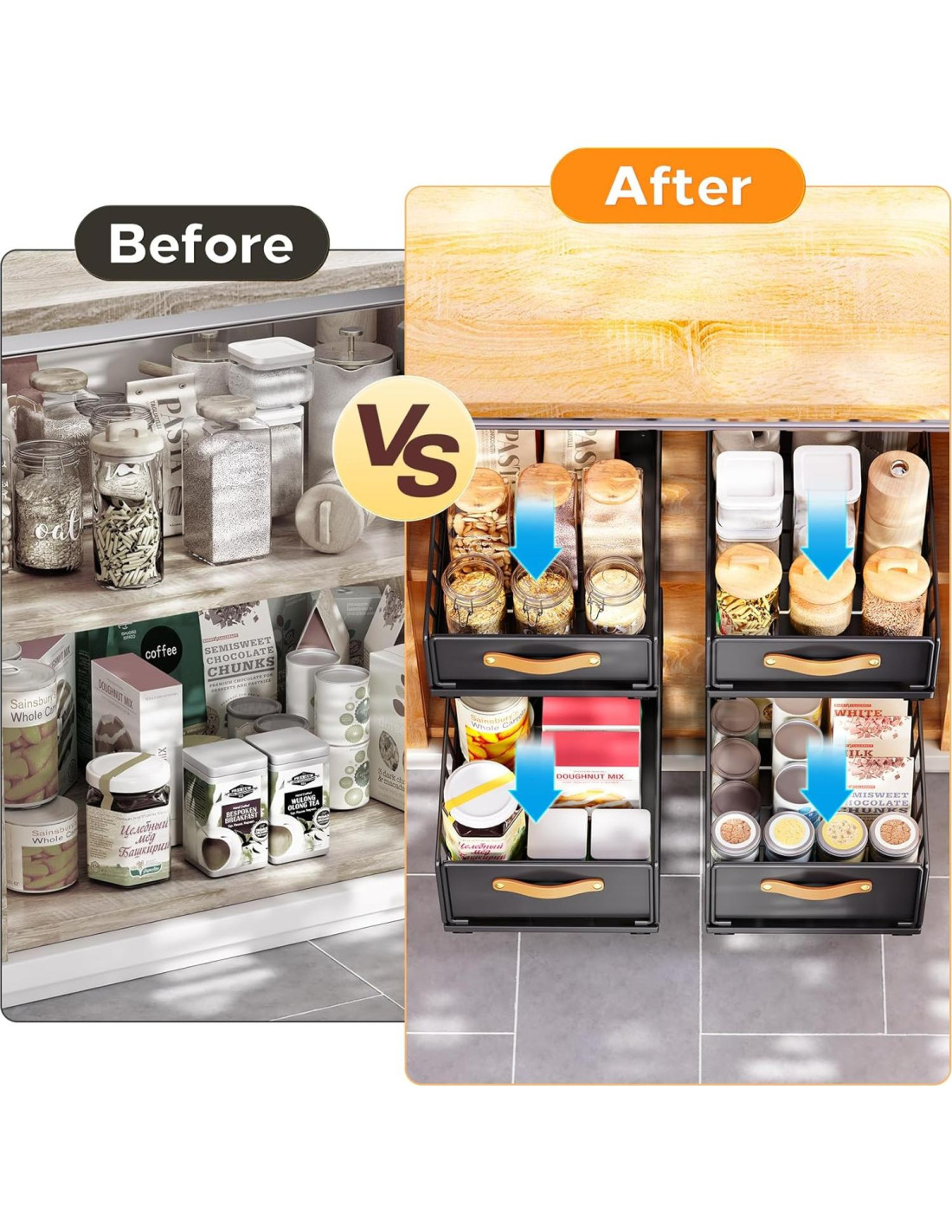 Acceso sin esfuerzo con nuestro organizador extraíble. La guía de riel de extensión completa asegura un deslizamiento silencioso y suave para una despensa ordenada. Simplifica el almacenamiento hoy mismo!