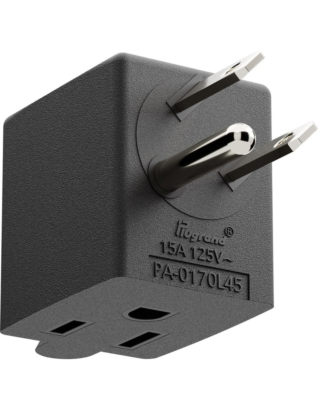 - Plugrand SKU#: PA-0170L45 Adaptador de poder AC con ángulo izquierdo de 15Amp 125Volt Nema 5-15P (Machos de 3 Patas USA) a 5-15R (Hembras de 3 Patas) con ángulo hacia la izquierda.
