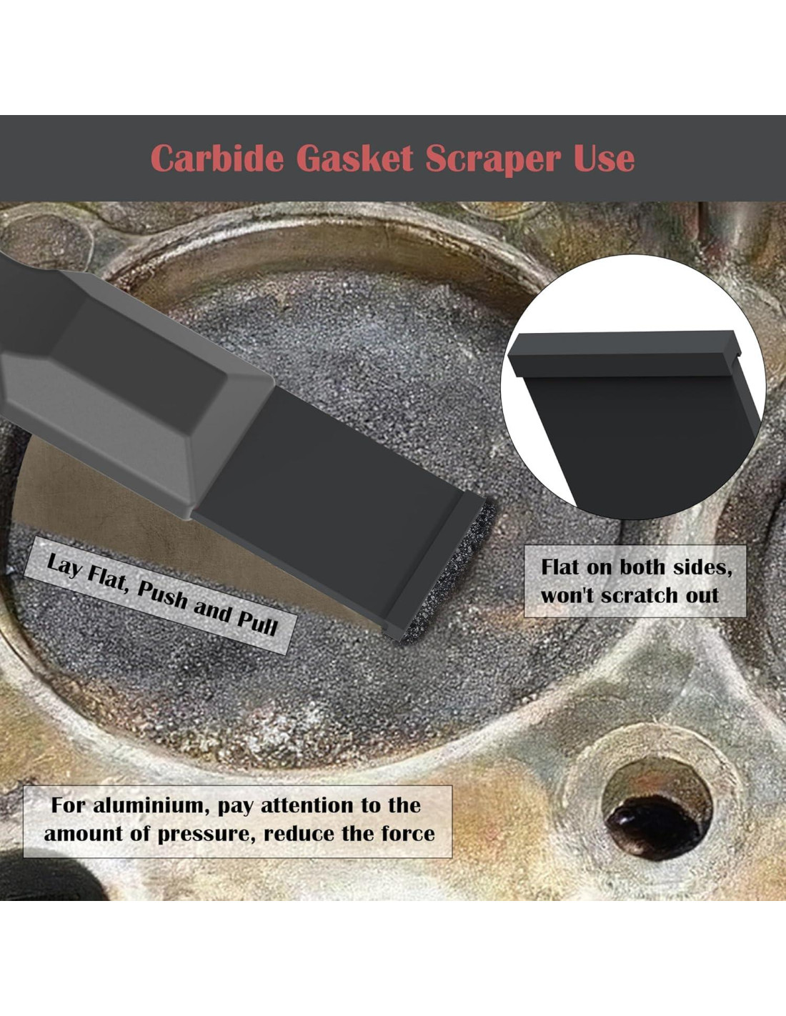 - [Aplicación] Herramienta Raspador de Carburo utilizada para eliminar residuos de juntas de cabezas de acero y aluminio, junto con acumulación de carbono e incluso óxido y limpiar deslizadores de pinzas de freno de disco. No está destinada a ser utilizada para raspar vidrio o como escobilla de parabrisas.
