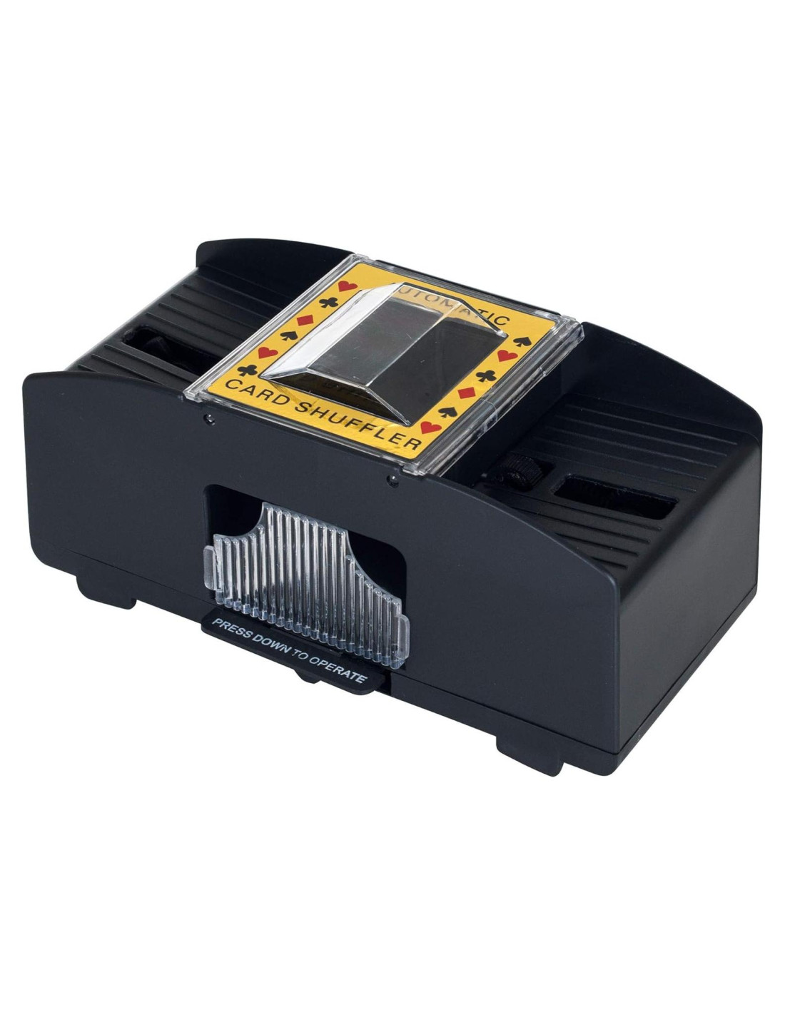 Este Barajador de Cartas Automático (1-2 Barajas) funciona con baterías. Baraja cartas de juego de tamaño estándar o de puente. Las cartas de juego y 4 baterías de tamaño "AA" no están incluidas.