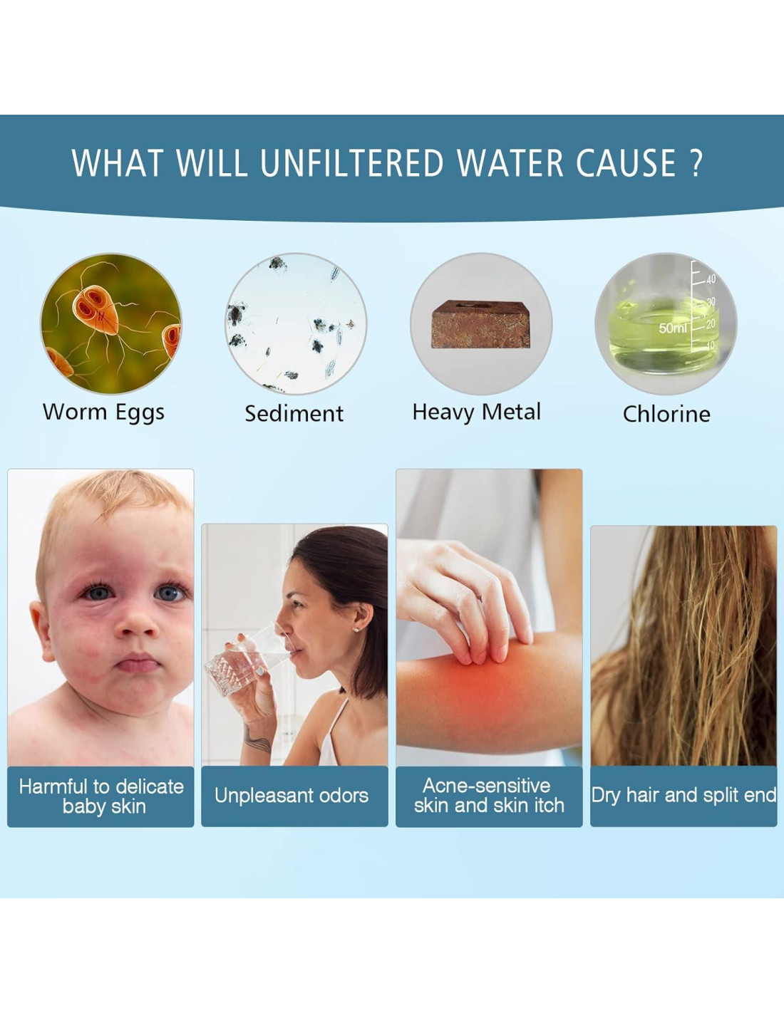 - Agua Saludable y Cuidado del Cuerpo: Este filtro de ducha actúa como un humectante, purificador, ofreciendo una limpieza efectiva para reducir el nivel de cloro, fluoruro, metales pesados, sustancias orgánicas u otros sedimentos, que ayudan a proteger la piel sensible, mejorar la condición de las uñas, rejuvenecer el cabello dañado y reducir olores desagradables.