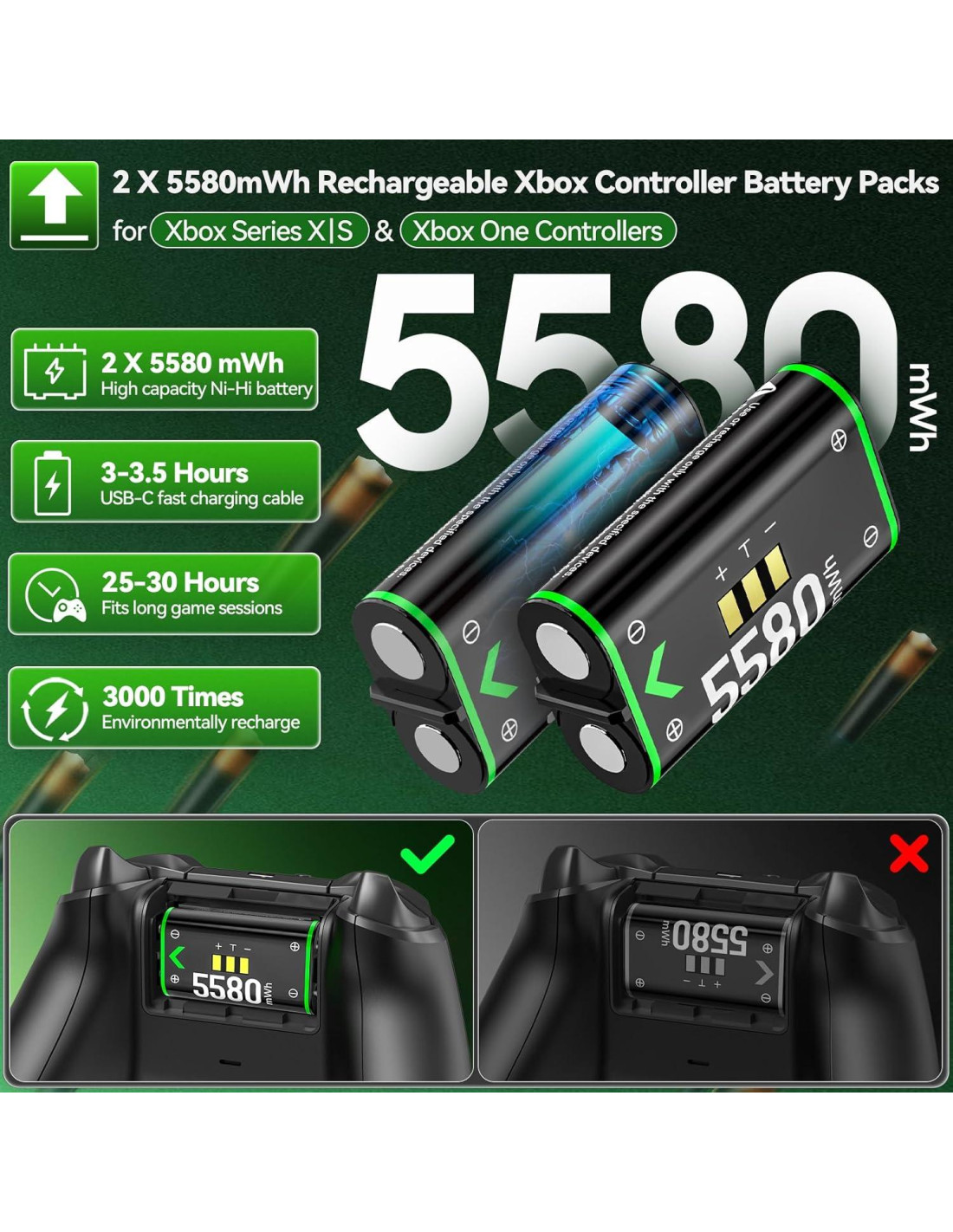- Por favor, tenga en cuenta: Estas baterías y cubiertas de batería son SOLO compatibles con los controladores originales de Xbox Series X|S y Xbox One X|S / Xbox One/ Elite. NO son compatibles con controladores de Xbox 360 ni con controladores de Xbox de terceros. PARA EL MÉTODO DE INSTALACIÓN CORRECTO DE LA BATERÍA, CONSULTE LA DEMOSTRACIÓN DE IMÁGENES.