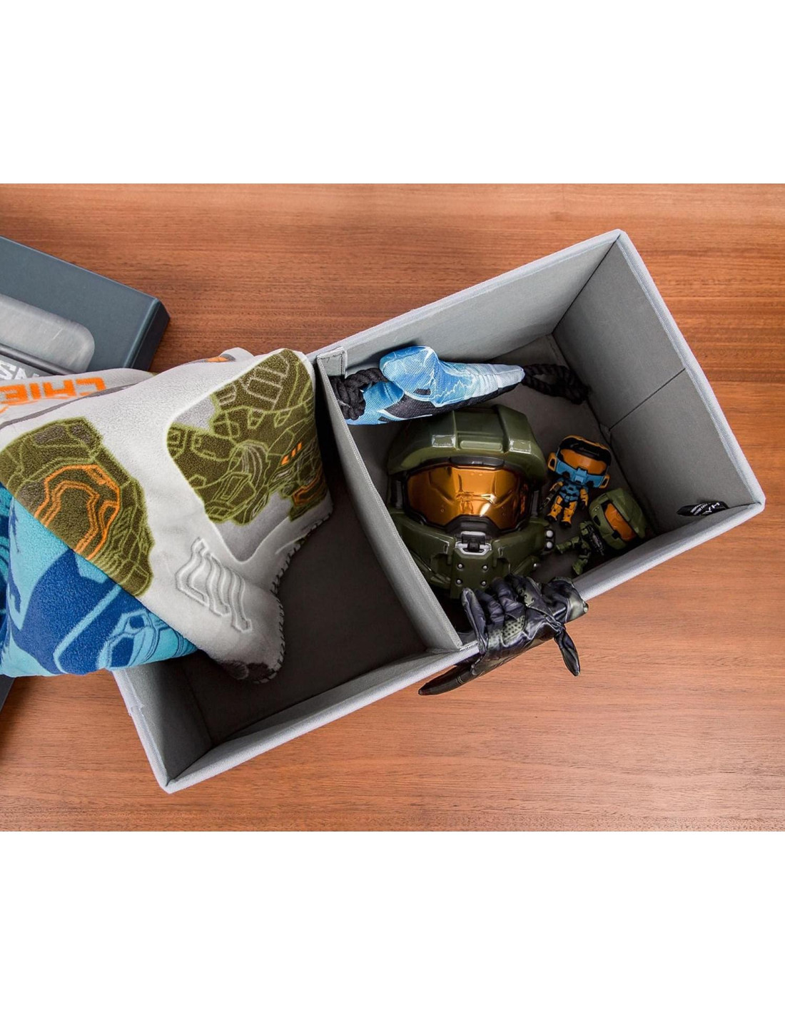 - Bloqueo y Carga: Mejora tu espacio con este organizador de cubo de tela. Diseñado para parecerse a un cofre UNSC del videojuego HALO, este cofre de almacenamiento te ayudará a organizar y gestionar tu desorden.