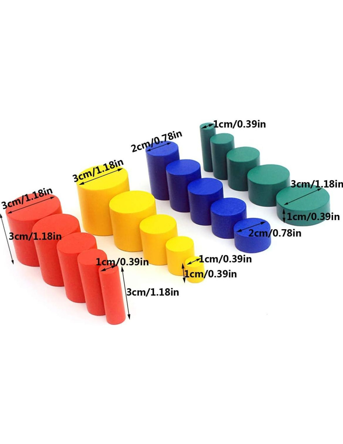 - 4 Conjuntos de cilindros que varían en altura y/o diámetro en cada bloque y 6 combinaciones diferentes de tarjetas, tamaño: 1-3cm (0.39in-1.18in); Por favor, permita un error mínimo debido a la medición manual. Asegúrese de que no le importe antes de pujar.
