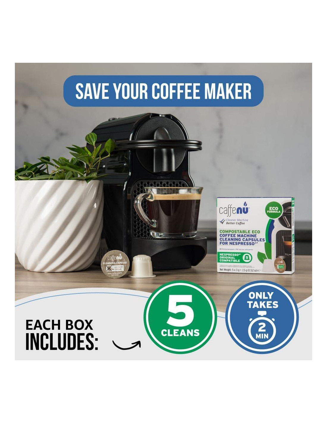 Caffenu inventó la primera cápsula de limpieza para cafeteras Nespresso. Para un café con mejor sabor.