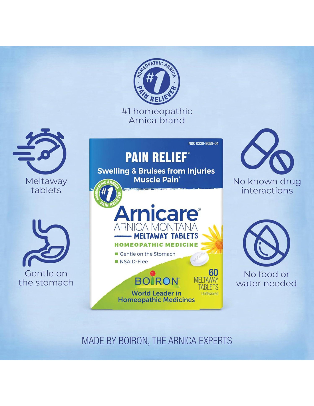 - DISOLVER EL DOLOR MUSCULAR: Las tabletas de alivio del dolor Arnicare se disuelven en la boca sin necesidad de agua y se pueden tomar con el estómago vacío. Simplemente deja que las tabletas se disuelvan bajo la lengua para experimentar alivio de dolores y molestias diarias.
