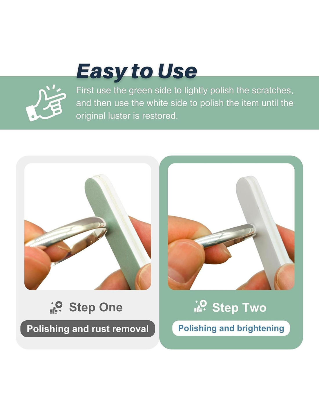 - [ELIMINAR RAYONES DE JOYERÍA] El lado verde de los palitos de pulido plateados es una superficie de pulido, que puede pulir y eliminar eficientemente el deslustre y reparar rayones menores en la superficie de la joyería.