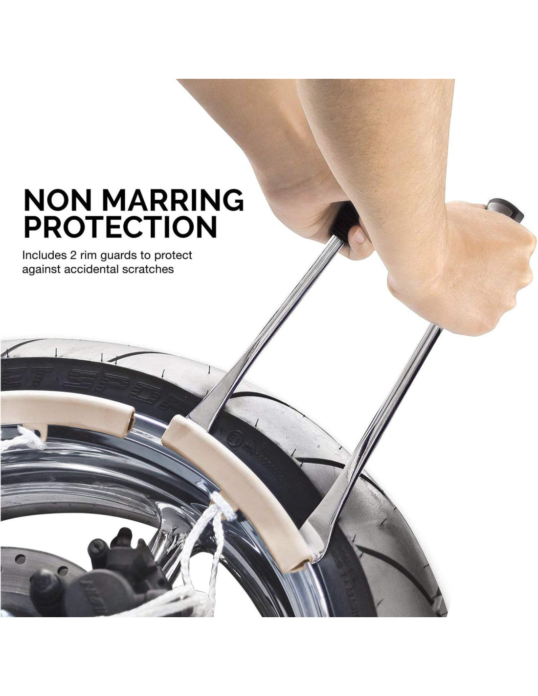- MATERIALES DE CALIDAD: Los protectores de llanta están construidos con un material de polipropileno flexible que mantiene tus llantas protegidas de daños, y los ejes de las palancas de neumático tienen un acabado de cromo pulido para una suave inserción en tus neumáticos.