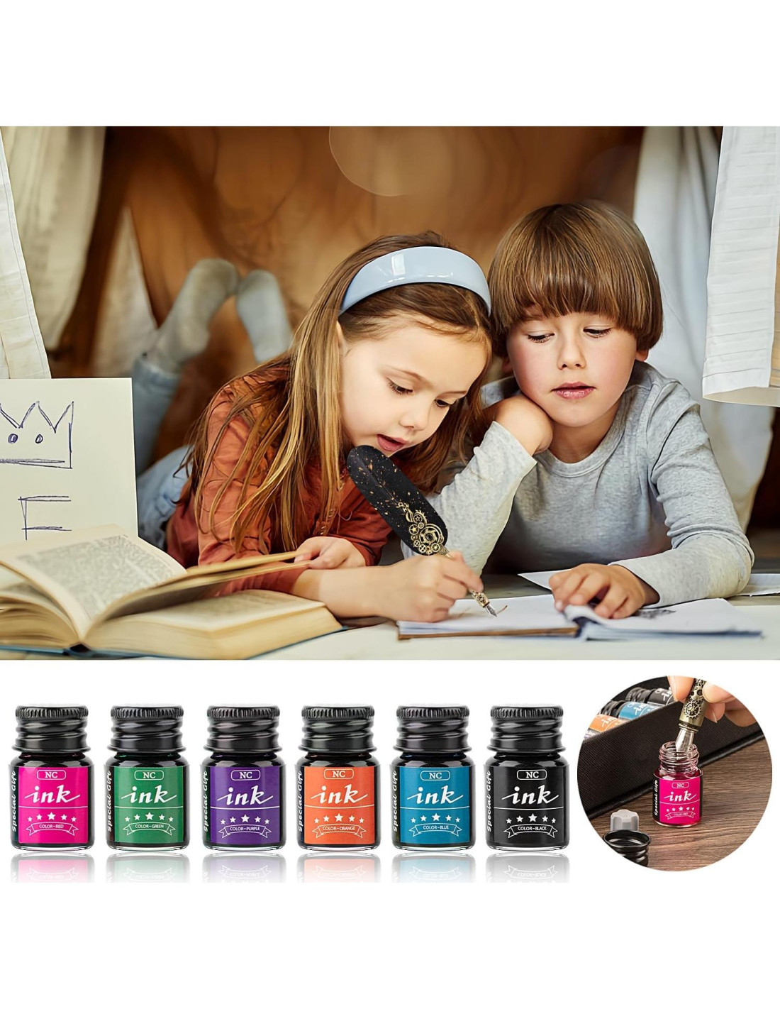- [EL JUEGO DE TINTA DE PLUMA DE PENA INCLUYE] 1x Pluma de Pavo, 6x Botellas de Tinta (Negro, Verde, Azul, Púrpura, Rojo, Naranja), 4x Puntas de Acero Inoxidable en Diferentes Tamaños, 1x Soporte para Pluma, 1x Hermosa Caja de Regalo.