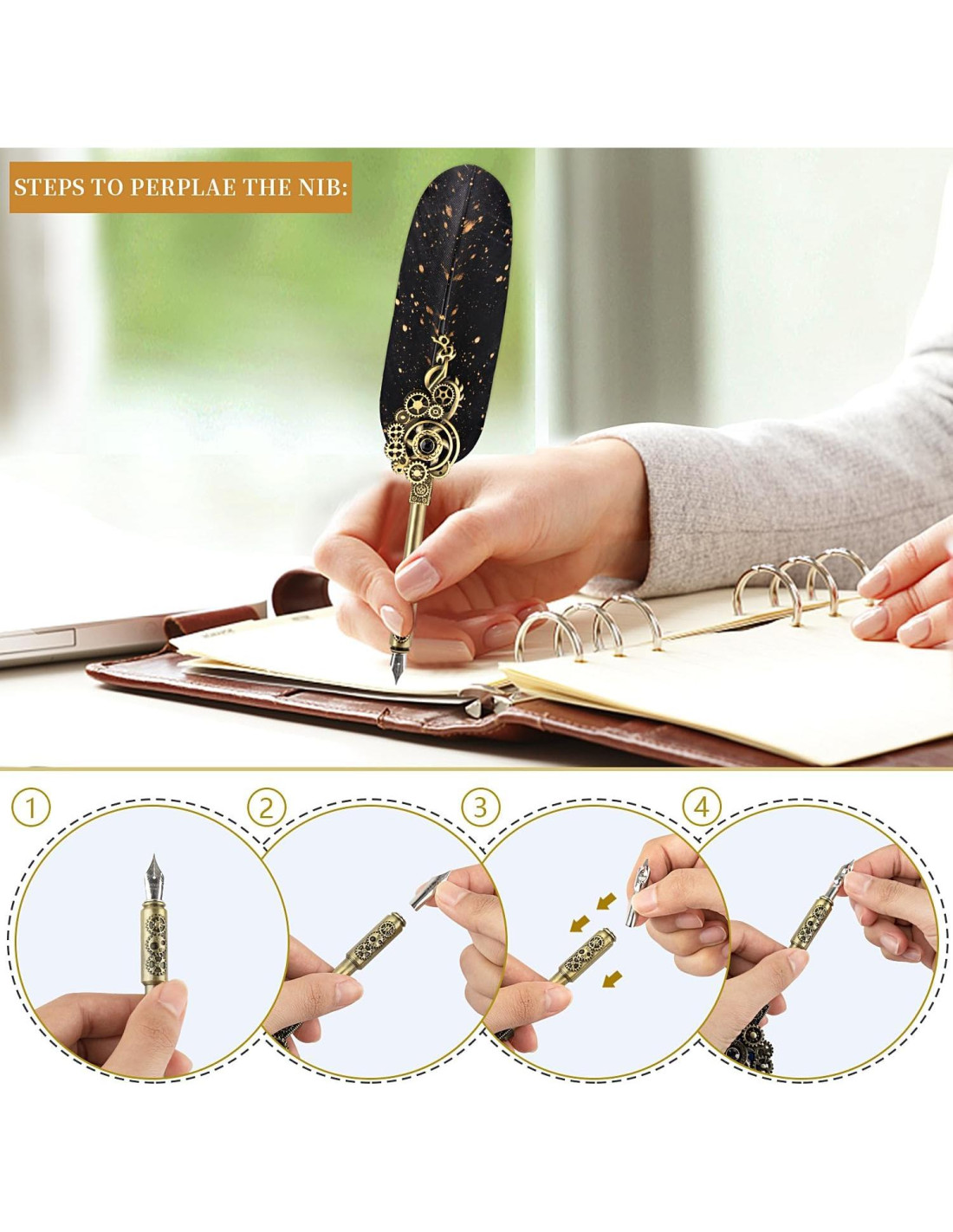 - [DETALLES ELEGANTES] Cada pluma se obtiene de la naturaleza alrededor del mundo, naturalmente desprendida por aves, y la pluma es elaborada por los experimentados artesanos de NC utilizando un proceso especial. Las plumas están adornadas con polvo dorado brillante, que refleja el hermoso brillo artístico en cualquier luz. Este juego de caligrafía irradia elegancia y arte, ya sea en tu hogar u oficina, en tu escritorio o mesa de café.