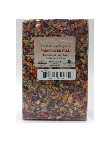 Los Copos de Hoja Tamise de Productos Sepp Leaf son más pequeños que los copos Schaibin, y miden entre 0.64 cm a 2.54 cm de tamaño. Úsalo con cualquier proyecto de dorado como un pequeño toque de color o para crear textura. Los copos de forma irregular crean una apariencia de hoja agrietada. Aplica como lo harías con cualquier hoja metálica para un acabado artístico y distintivo. Este paquete contiene 4.5 gramos de Copos de Otoño Variegado de Italia. Nota: puede aparecer un cambio de color cuando los copos son recubiertos.