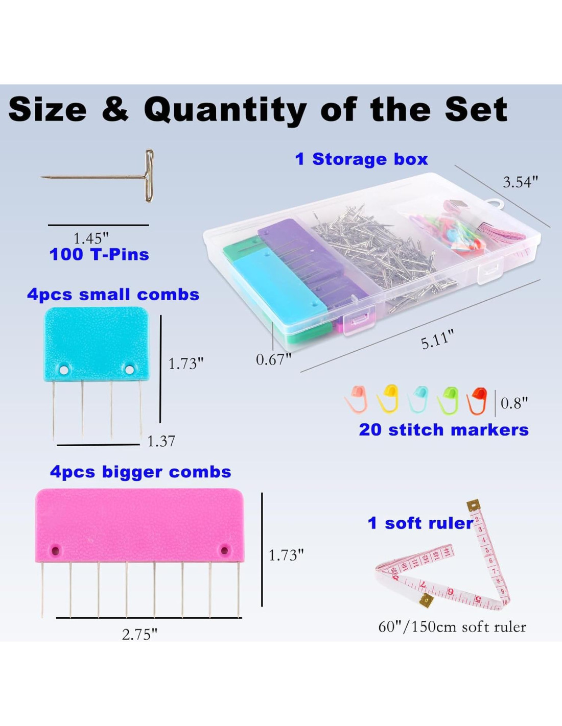 - Componentes incluidos: 8 bloqueadores de ganchillo, 100 pines en T, 20 marcadores de puntos, 1 regla suave, 1 estuche de almacenamiento