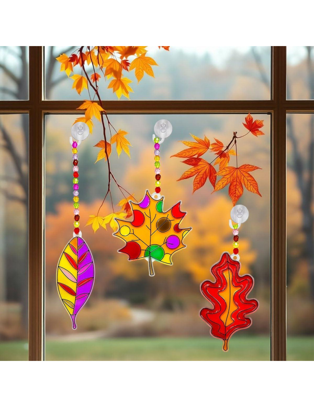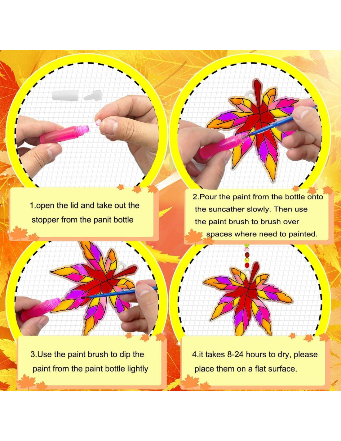 - Manualidades de otoño para adultos: Recibirás 32 piezas de atrapasoles de hojas de otoño en 8 estilos, 24 botellas (6ml por botella) de pintura en 8 colores, 450 piezas de cuentas acrílicas, 30 pinceles de 12.5 cm, un rollo de 15 m de hilo de pesca y 32 ganchos de succión de 2.5 cm. Cada atrapasoles de hoja de otoño tiene un agujero, y el kit de arte en ventanas viene con un hilo para fácil colgado.