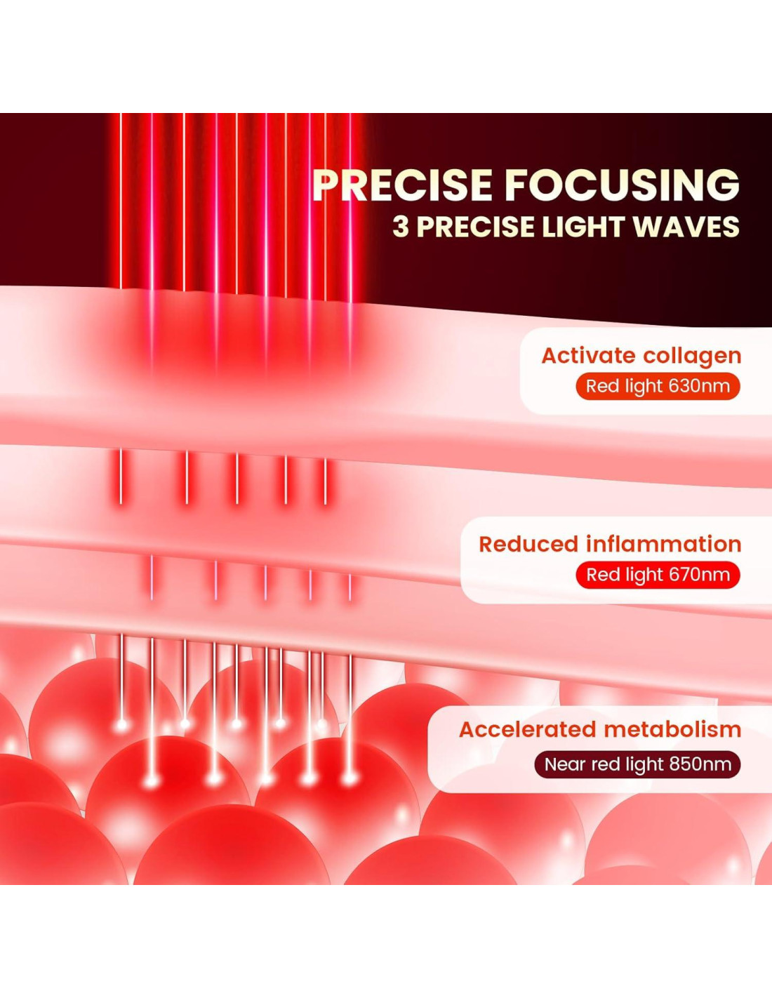 - Luz Roja de 630nm 670nm y Luz Infrarroja Cercana de 850nm: El dispositivo de terapia de luz roja Viconor tiene tres modos para elegir así como tres fuentes de luz, 630nm, 670nm y 850nm. La luz roja de 630nm y 670nm es luz visible que activa el colágeno, reduce la inflamación y es buena para la piel y el cuero cabelludo. La luz infrarroja cercana de 850nm es luz invisible que puede penetrar profundamente en músculos y huesos, aliviar dolores y molestias musculares, y acelerar el metabolismo.