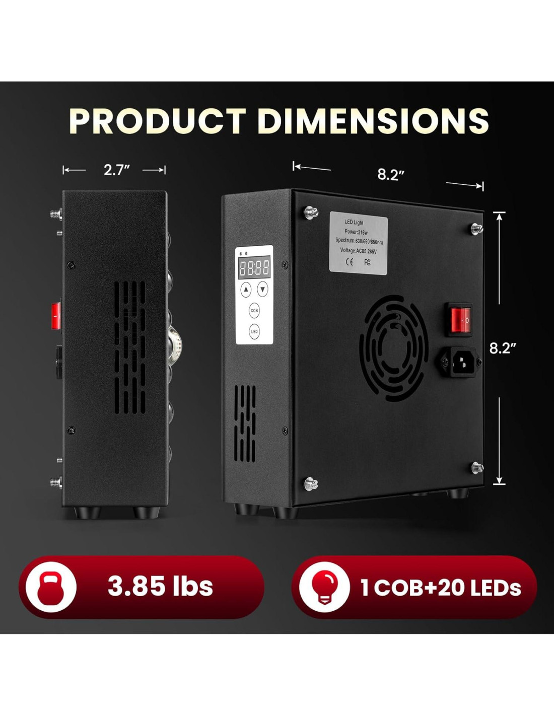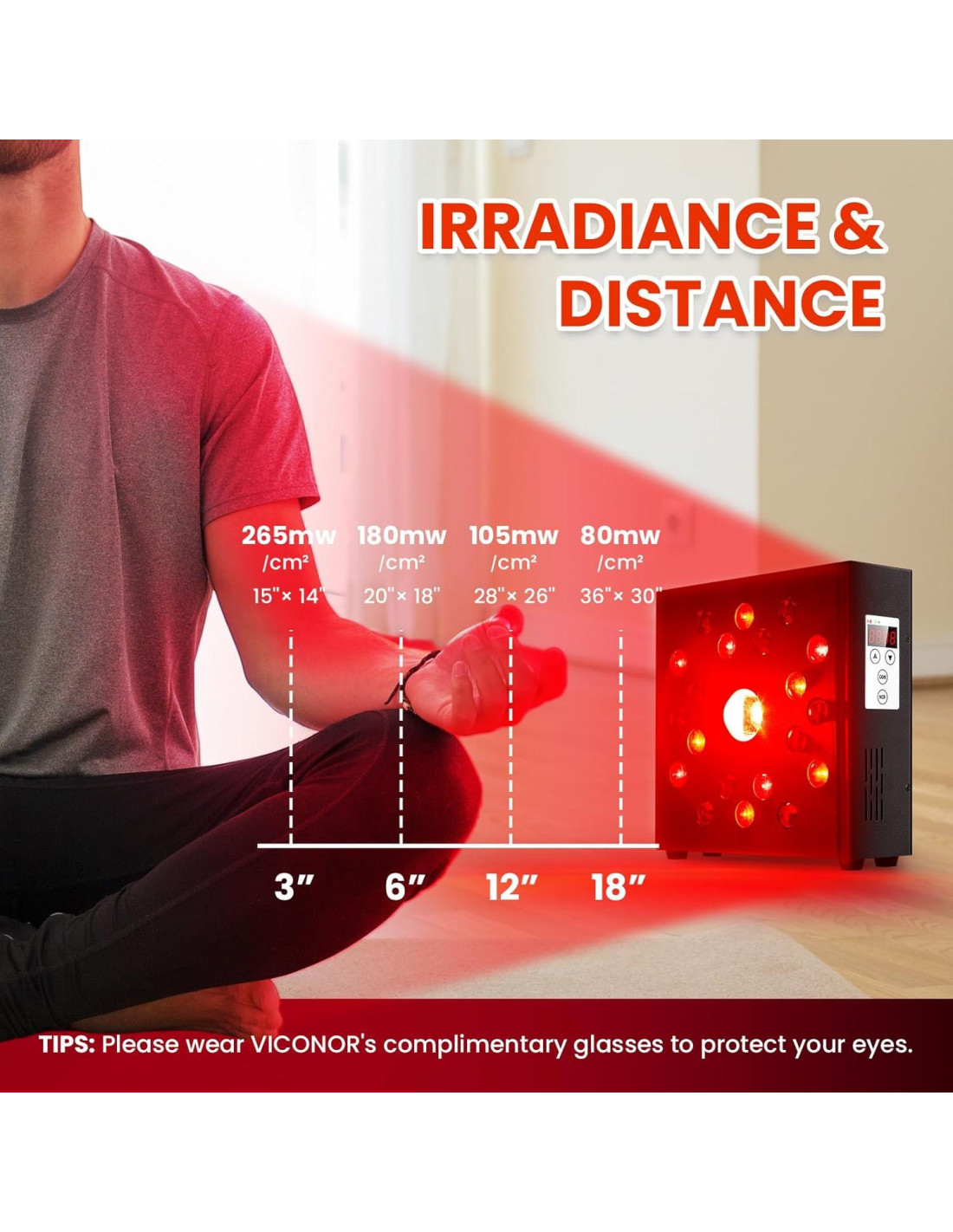 - 216W de Potencia y Alta Irradiación: El dispositivo de Terapia de Luz Roja Viconor tiene 216W de potencia y una irradiancia de 180mW/cm a 15.24 cm, el bead de lámpara COB único tiene un efecto más fuerte de penetrar la capa superficial de la piel. El consumo de energía es el factor más crítico para determinar el éxito de un tratamiento; cuanto mayor sea el consumo de energía, mejores serán los resultados. Si buscas reducción de arrugas, salud de la piel, mejor sueño, energía y rendimiento, o una rápida recuperación del ejercicio, nuestra terapia de luz roja e infrarroja cercana puede ayudar.