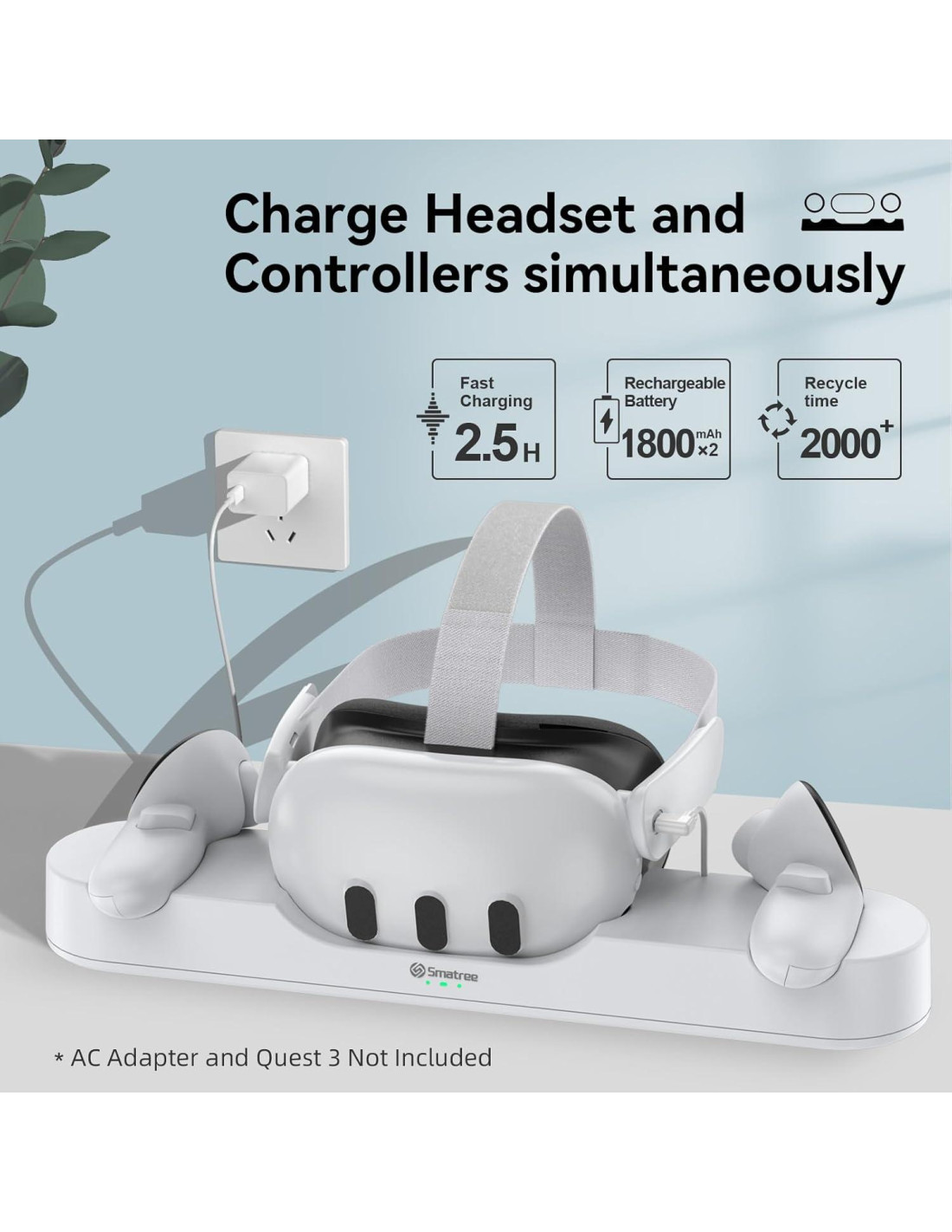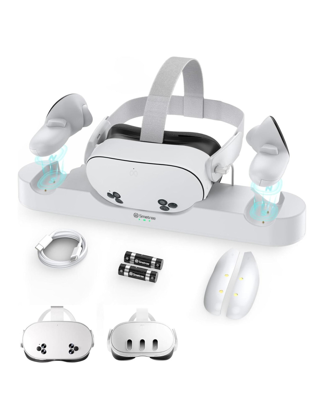 - ¿Qué recibirás?: El paquete incluye: 1 x base de carga Smatree compatible con Quest 3S/Quest 3, 1 x cable USB C-C, 2 x cubiertas de batería, 2 x baterías AA recargables, 1 x manual del usuario. Por favor, nota que este paquete NO incluye adaptador de CA. Sugerimos usar el adaptador original
