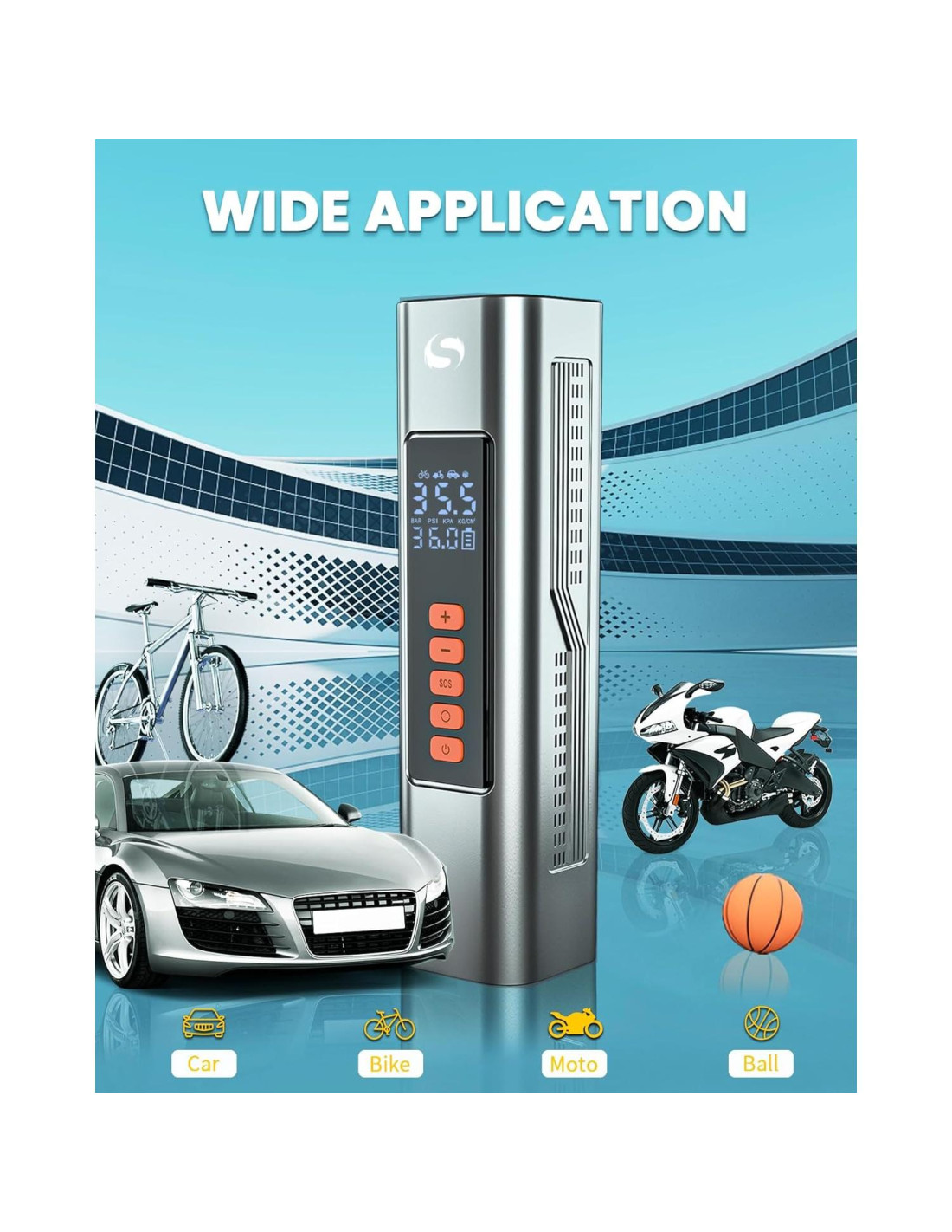 - USO MULTIFUNCIONAL: Esta bomba de aire para neumáticos de coche portátil no solo puede inflar pelotas, bicicletas, motocicletas y coches, sino que esta bomba de aire para neumáticos de coche portátil también tiene 3 modos de iluminación: luz, estroboscópica y SOS, que se pueden usar en la oscuridad o en emergencias. Además, la bomba de bicicleta portátil tiene un puerto de salida USB para proporcionar energía de emergencia para tu teléfono. También se incluye un martillo de seguridad en los accesorios, que se puede usar como rompeventanas si es necesario.