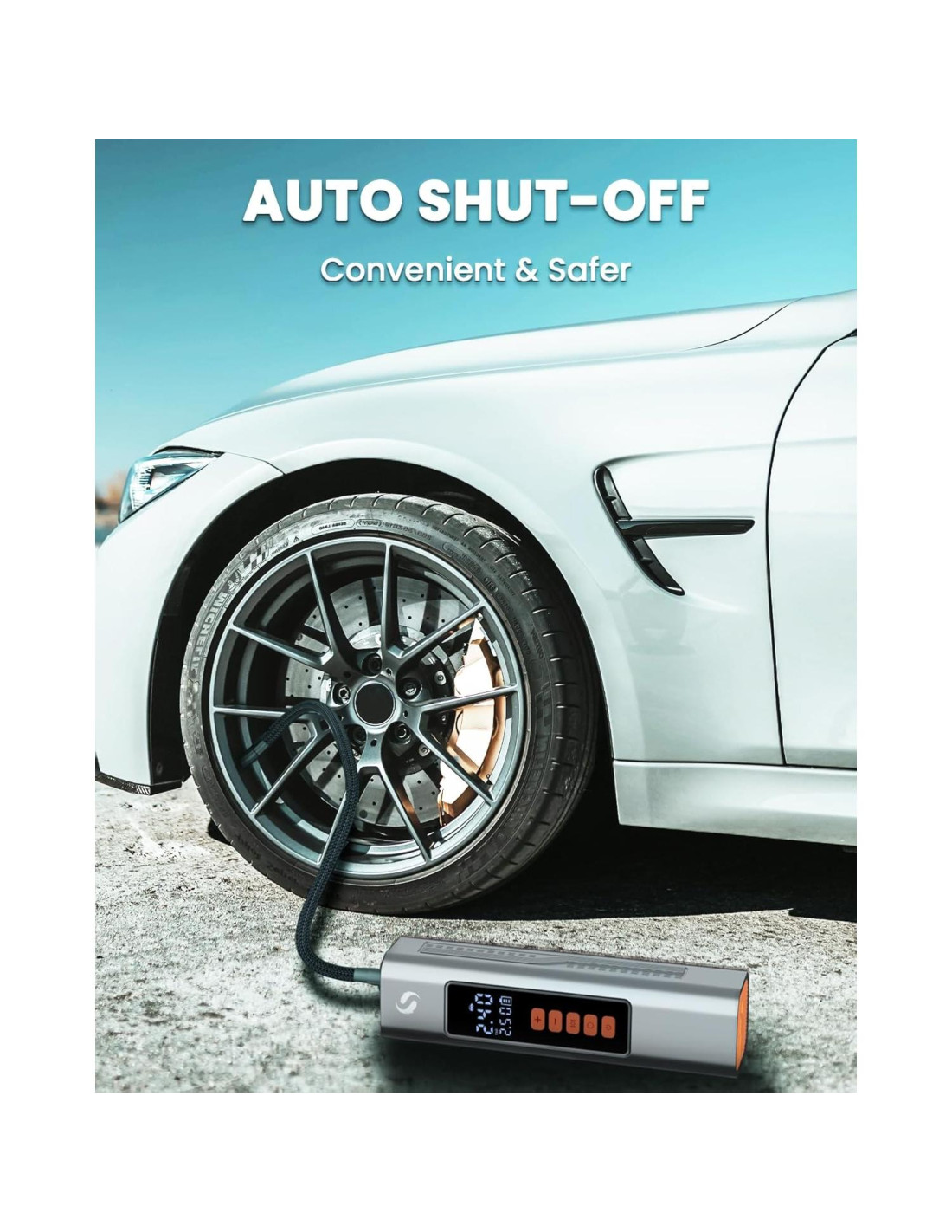 - FÁCIL DE USAR Y SE APAGA AUTOMÁTICAMENTE: Simplemente conecta la manguera de aire a tu coche y presiona el botón "inicio" en el centro de la bomba de aire para coche. Luego usa los botones de control "+" y "-" en la bomba para presurizar, y una vez que se alcanza la presión correcta, la bomba de inflado de neumáticos para coche se apagará automáticamente. Esta bomba de inflado de neumáticos para coche portátil puede inflar fácilmente casi cualquier neumático y reporta datos precisos en tiempo real.