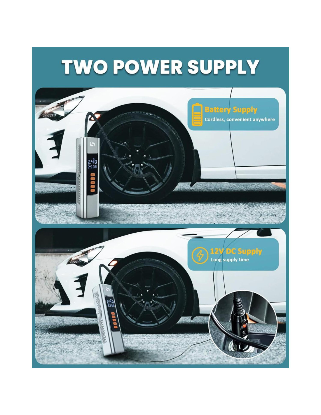 - DOBLE FUENTE DE ALIMENTACIÓN: Nuestros compresores de aire para coche están disponibles tanto en modo de batería recargable como en modo de alimentación de 12V DC. En el modo de batería, puedes inflar los neumáticos de tu coche en cualquier momento y lugar. Al mismo tiempo, también puedes usar el modo de alimentación de 12V DC para alimentar tu bomba de neumáticos, por lo que no hay necesidad de preocuparse incluso si la batería de la bomba de aire se agota. En resumen, el compresor de aire portátil SM04 es una herramienta imprescindible para lidiar con problemas de neumáticos en la carretera.