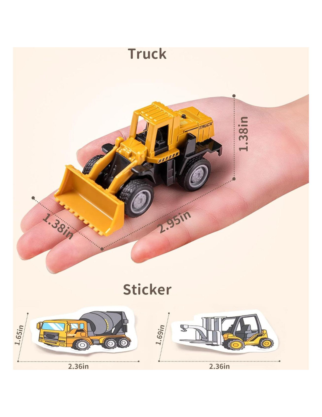 Cabeza de camión de metal aleado y parte de plástico ABS. Material plástico seguro y no tóxico que es seguro para los niños. El material es muy fuerte y duradero, resistente a caídas. Todos estos camiones han pasado la certificación de juguetes de EE. UU. - CPC, CPSIA y ASTM. Cada coche mide aproximadamente 8.0*3.3*4.3 cm, adecuado para las manos pequeñas de los niños. Estos vehículos de construcción son portátiles, lo que los hace fáciles de llevar y almacenar. Permite a los niños jugar en cualquier momento y lugar.