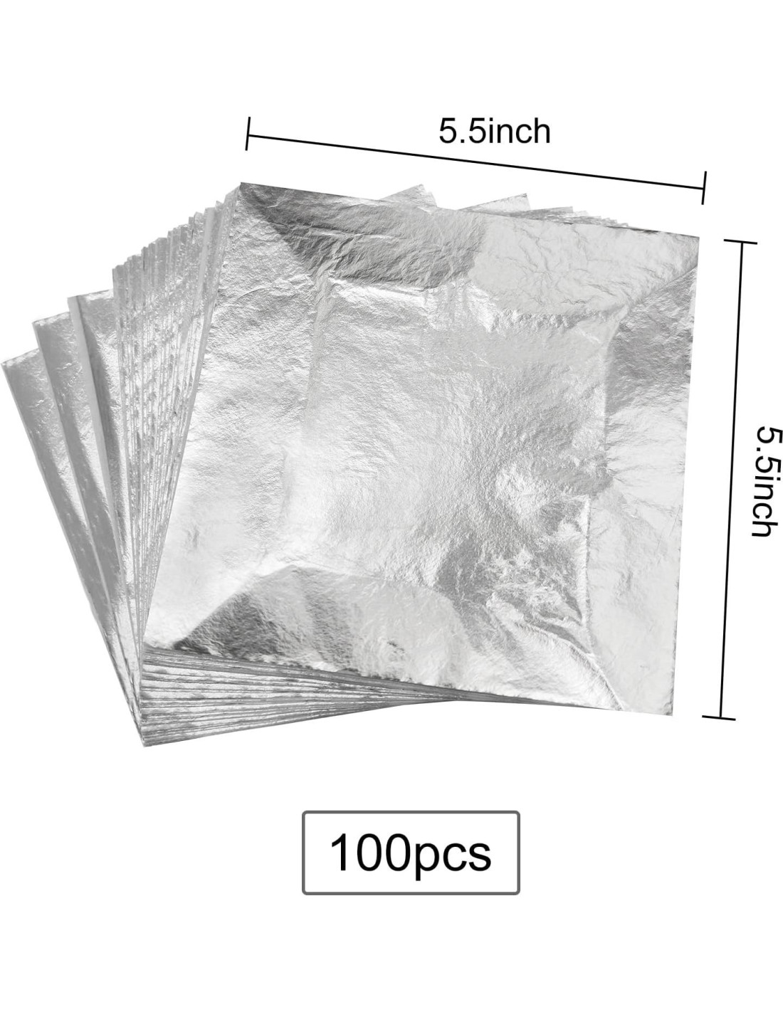 Detalles del producto: cada hoja de imitación tiene una longitud y ancho de aproximadamente 14 x 14 cm; Color: plateado; Cantidad: 100 hojas