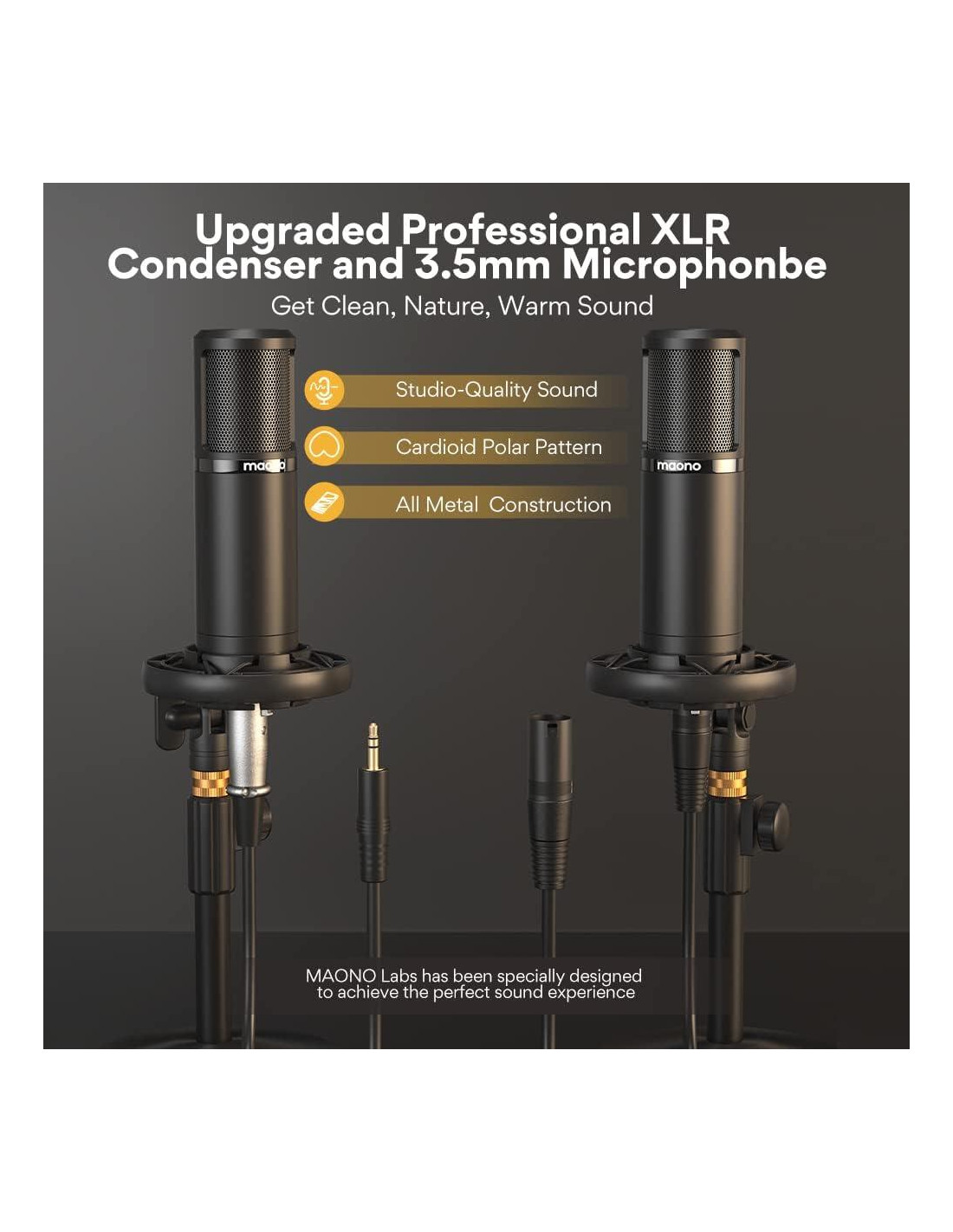 - Dos micrófonos de condensador premium para grabación de sonido clara: Excelente rendimiento de audio para sonido cristalino. Alta sensibilidad y relación señal-ruido capturan cada palabra claramente. El patrón polar cardioide recogerá audio frente a la fuente de sonido mientras rechaza el ruido no deseado, garantizando un sonido claro y rico para ser grabado. Un micrófono XLR profesional y un micrófono de 3.5MM han sido desarrollados especialmente por el laboratorio MAONO para proporcionar una calidad de sonido perfecta