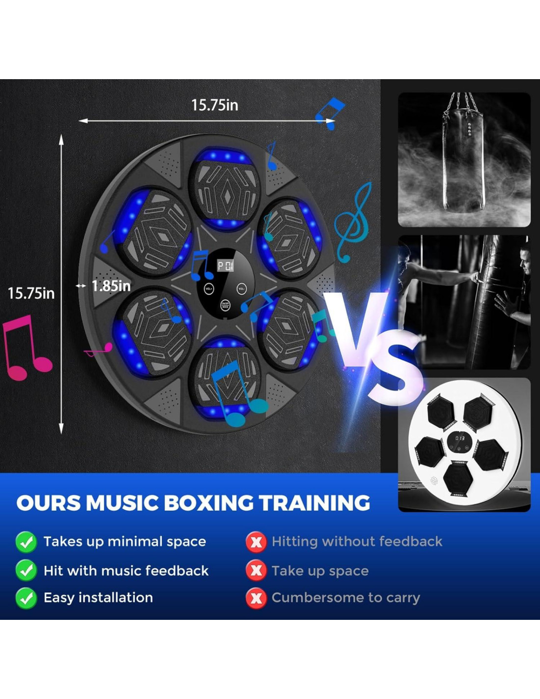 - BOXEO MUSICAL BLUETOOTH - Conecta tu dispositivo a través de Bluetooth y reproduce tus canciones favoritas. La función de conteo inteligente rastrea cada golpe, creando un ambiente de entrenamiento motivador y enérgico. ¡Ideal para amantes de los golpes musicales!