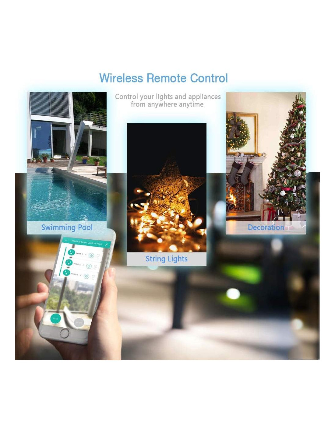- 3 Tomas Inteligentes Individuales: La regleta wifi inteligente TESSAN viene con 3 tomas; Tres tomas de CA se pueden controlar de forma individual o simultánea; Con diseño impermeable IP44, cubiertas a prueba de clima integradas para cada toma; Protege las tomas de la lluvia y el polvo cuando no están en uso; El enchufe inteligente se puede colocar en interiores y exteriores; Ideal para tu jardín, patio, luces de cadena y decoraciones, luces de paisaje, fuentes, tomas eléctricas de alta resistencia, bombas de piscina (Máx 2HP), cortadoras de césped y más.