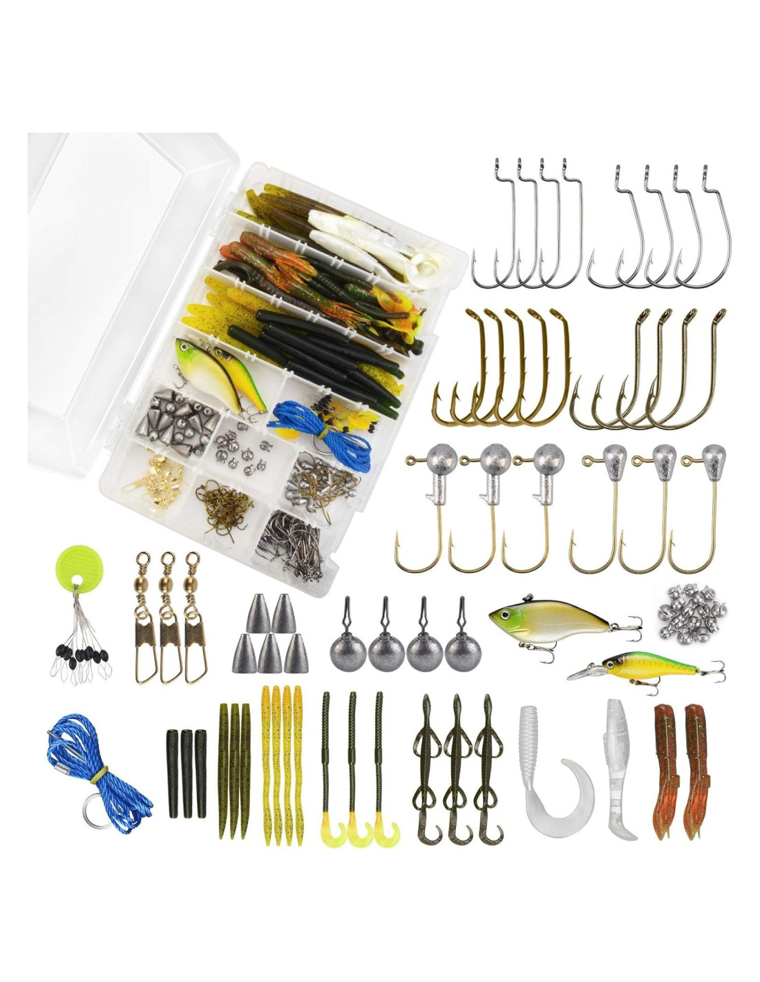 - Kit de Pesca de Bass - El kit de señuelos de pesca de MadBite para Bass incluye 187 piezas del equipo de pesca que necesitas para atrapar bass, excepto una caña de pescar y un carrete. Encontrarás una amplia variedad de anzuelos para bass en diferentes estilos y tamaños, Jigs de Bass, todos los estilos de pesas y plomos, artículos de accesorios terminales como giratorios y clips. También hay una amplia variedad de plásticos suaves como lombrices, cebos de criatura, jigs de tubo y más. También se incluye un crankbait de buceo medio y un crankbait sin labio.