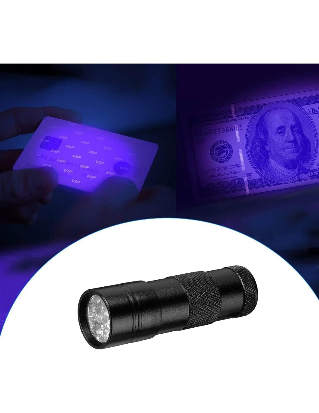 Aplicaciones UV: Las linternas moradas se utilizan a menudo para emitir luz ultravioleta. Esto es útil en diversas aplicaciones, como detectar moneda falsa, verificar tarjetas de identificación o examinar evidencia forense. La luz UV puede revelar detalles ocultos que pueden no ser visibles bajo condiciones de iluminación normales.