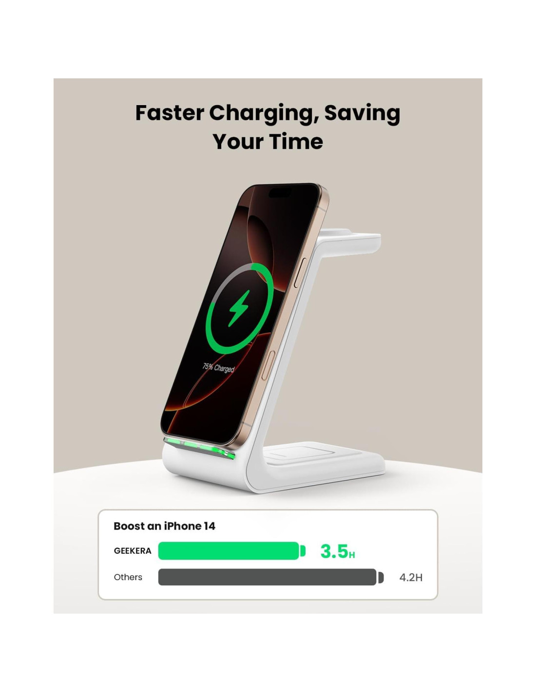- Estación de Carga Inalámbrica 3 en 1: ¡Libera tus manos con nuestro cargador inalámbrico VERDADERO! A diferencia de otros cargadores para iPhone, la estación de carga inalámbrica GEEKERA puede cargar tu iPhone, Apple Watch y AirPods simultáneamente. ¡Simplemente carga tu teléfono en modo horizontal o vertical según sea necesario! Ocupa un espacio mínimo en tu escritorio, manteniendo las cosas ordenadas y organizadas.