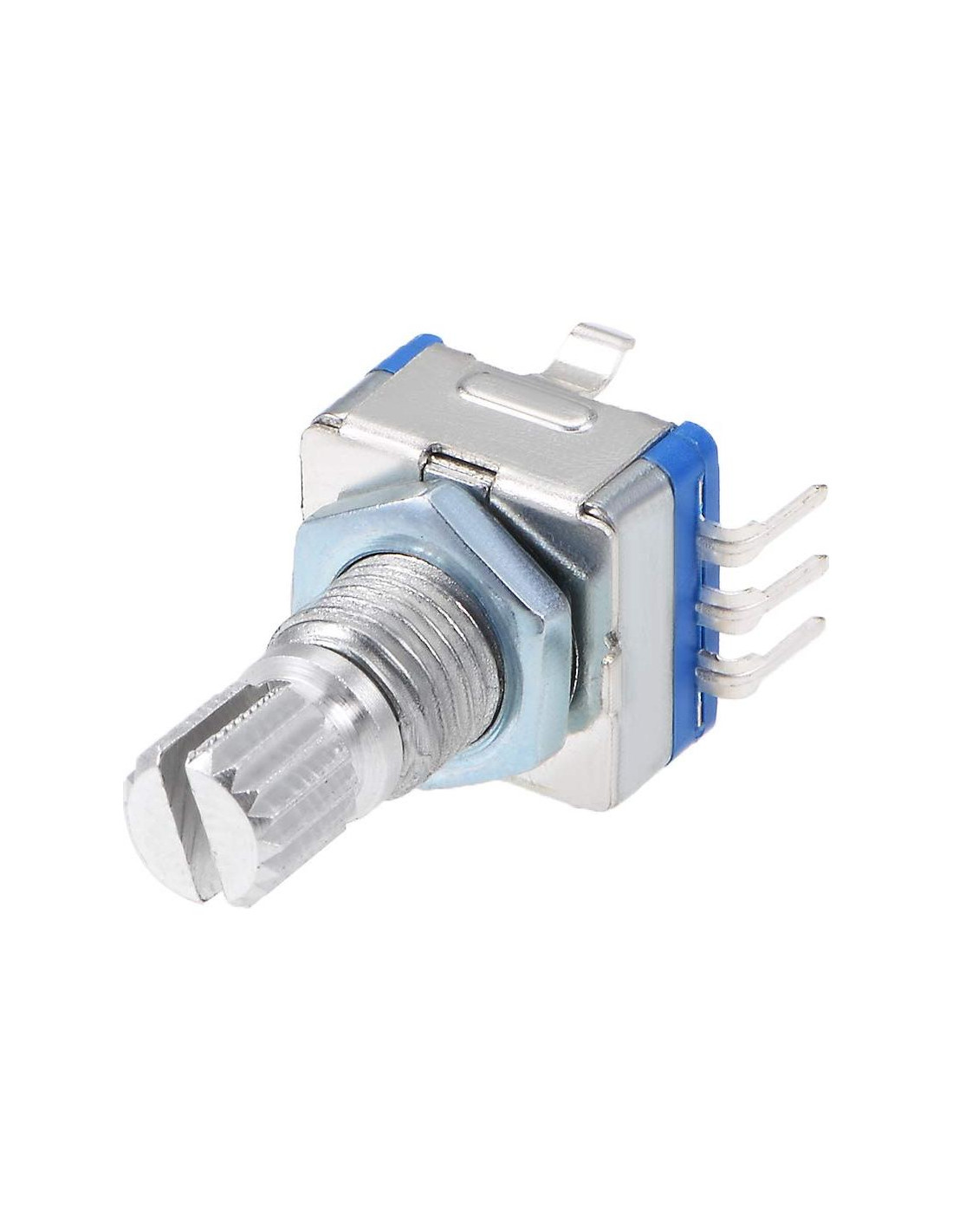 Descripción: Un encoder rotativo, también llamado encoder de eje, es un dispositivo electromecánico que convierte la posición angular o el movimiento de un eje o eje en señales de salida digitales. Los encoders rotativos se utilizan en una amplia gama de aplicaciones que requieren monitoreo o control, o ambos, de sistemas mecánicos, incluidos controles industriales, robótica, lentes fotográficas, dispositivos de entrada de computadora. Especificaciones: Método de ajuste: 360 Grados Número de pines: 7 Número de dígitos: 20 dígitos Voltaje nominal: 5 Volt Diámetro del eje: 6mm/0.24 pulgadas Altura del eje: 15mm/0.59 pulgadas Diámetro de la rosca: 6.8mm/0.27 pulgadas Dimensión total: 15mm x 12.5mm x 25mm / 0.59 pulgadas x 0.49 pulgadas x 1.0 pulgadas (L*W*H) Nota: Evite almacenar los productos en un lugar con alta temperatura y alta humedad.