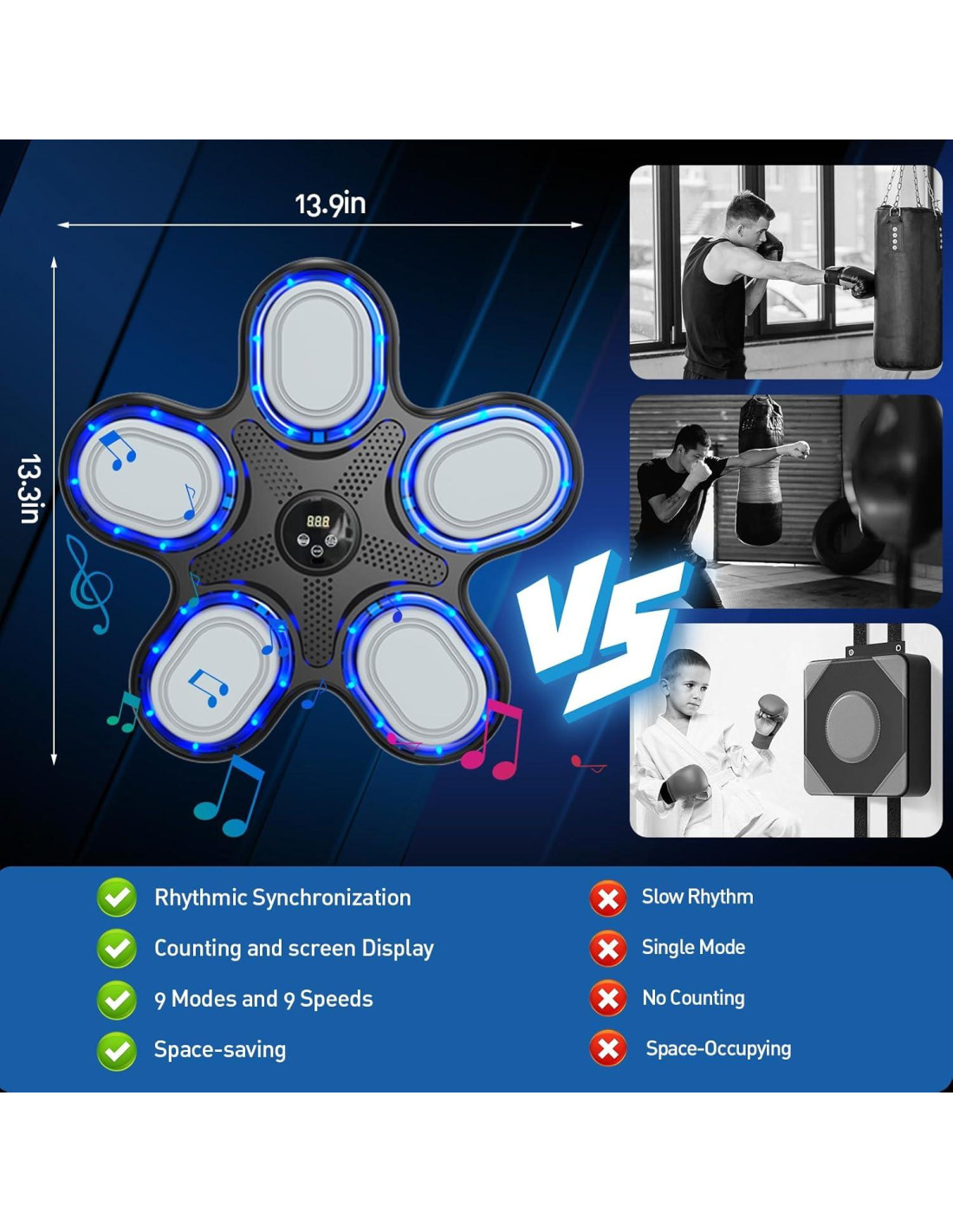 - Máquina de Boxeo Musical - Modos de Velocidad Múltiples e Iluminación Rítmica para un Fitness Divertido. Esta máquina de boxeo musical viene con múltiples niveles de velocidad ajustables y reacciones de luces LED vibrantes que se sincronizan con cada golpe, mejorando la agilidad y el ritmo mientras mantiene a niños y adultos completamente comprometidos durante los entrenamientos.