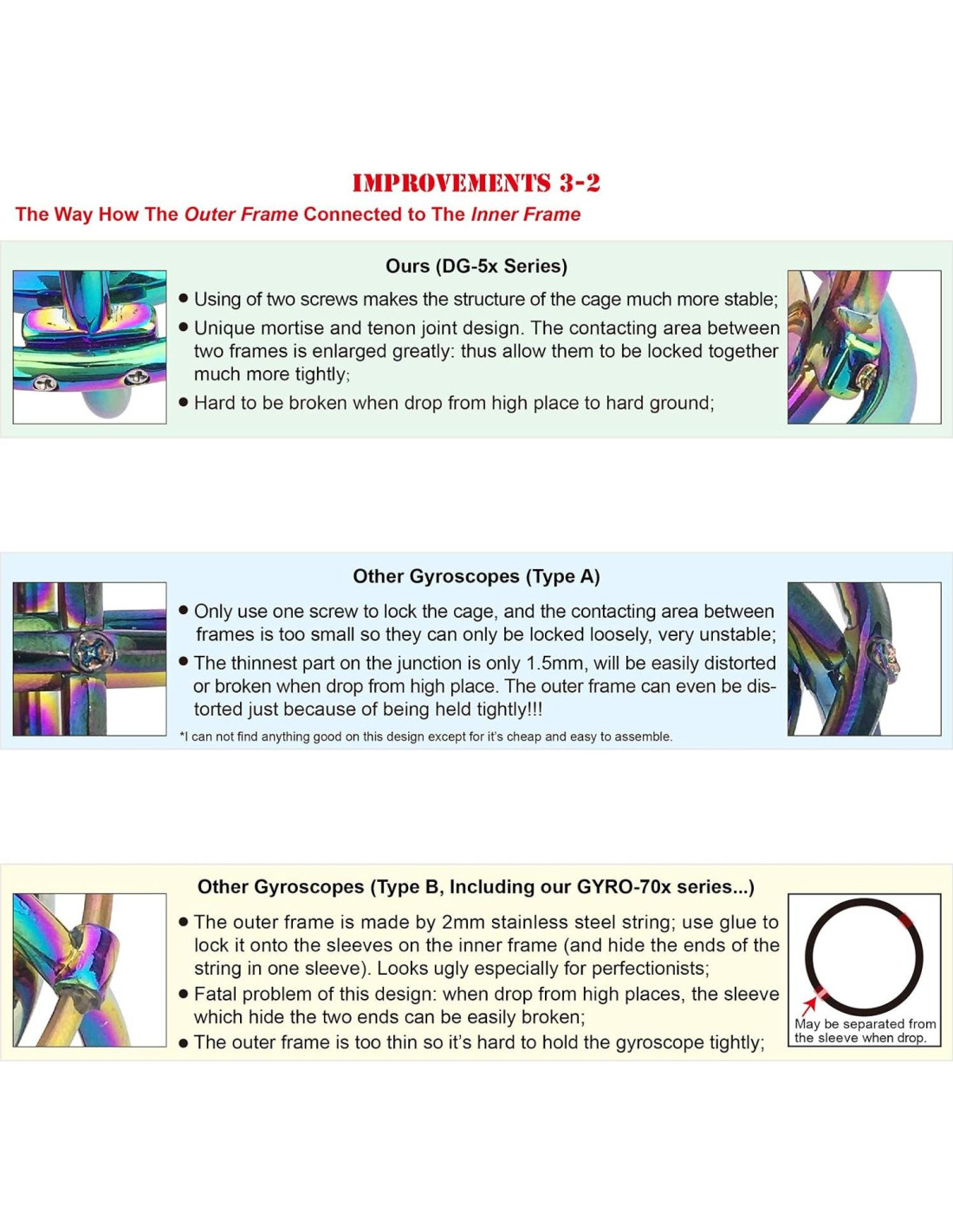 - PAGA MÁS PARA OBTENER UNA MEJOR EXPERIENCIA DE JUEGO: Creemos que nuestro DG-5PRO puede proporcionar una mejor experiencia de juego ya que se hicieron varias mejoras importantes para hacerlo más razonablemente estructurado, mucho más robusto, con un marco más grande y grueso (se puede sostener firmemente al tirar del hilo, obteniendo así una mayor velocidad inicial), más pesado y para hacer que su rotor gire más tiempo utilizando rodamientos de bolas. ¿Vale la pena los 20 o incluso 40 dólares más que pagaste? Tú decides.