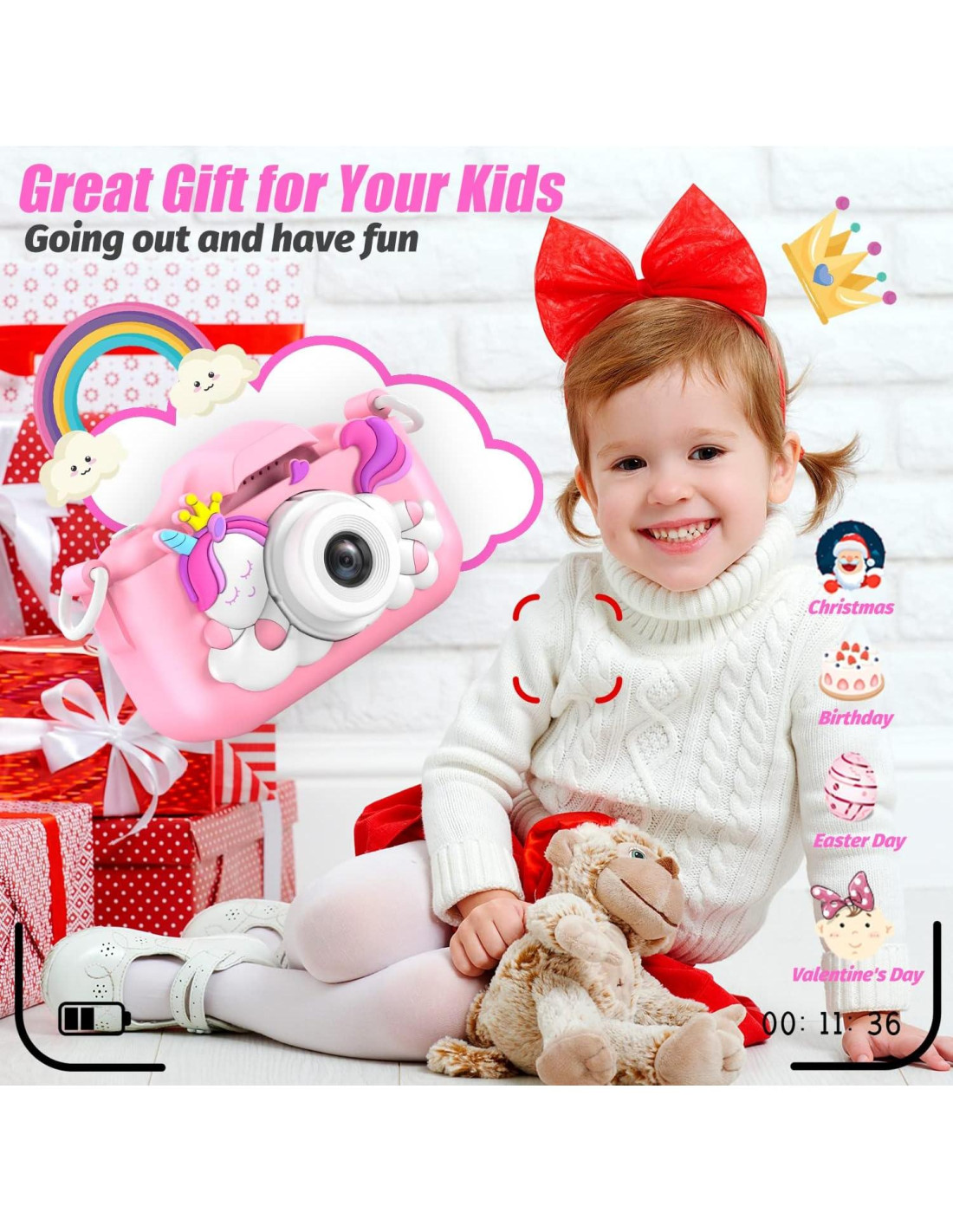 - [Regalo Perfecto de Unicornio para Niños y Niñas] Esta linda cámara de juguete infantil de unicornio es una excelente opción como regalo de cumpleaños, regalo de navidad, regalo de año nuevo o regalo de vacaciones para tus hijos de 3 a 12 años. Soporta selfies, modo de video y 3 juegos de rompecabezas, puede desarrollar la imaginación y creatividad de los niños, mejorar la diversión de la interacción entre padres e hijos.