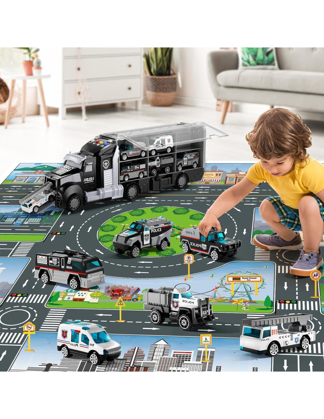 Los juguetes de policía para niños incluyen una alfombrilla de juego plegable, un gran camión transportador de policía con sonido y luces, ambulancia, camión de escalera, camión elevador, vehículo de cañón de agua, ambulancia, coche blindado y carretera simulada.