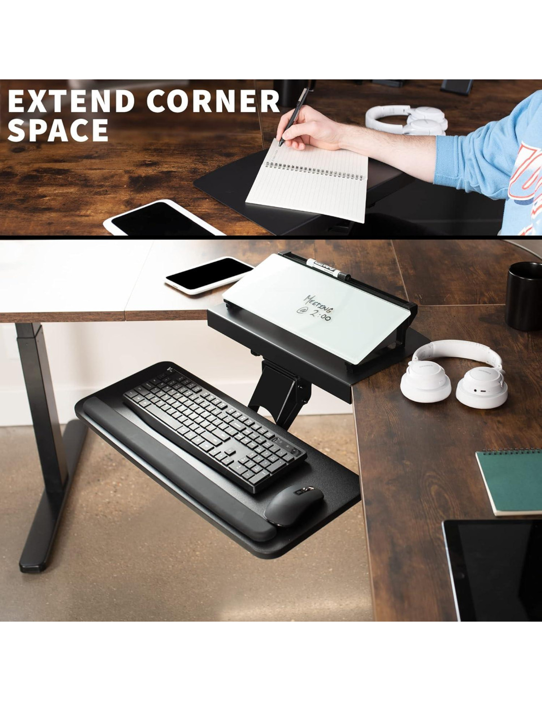 Perfecto para estaciones de trabajo en forma de L, esta bandeja ajustable te permite escribir y trabajar con el ratón en una posición más ergonómica. La placa de conector extiende el borde de tu escritorio en forma de L para permitir montar la pista directamente en la esquina. Mejora la Postura. Cuenta con ajuste de altura de 5" (12.7 cm), +6 a -22, y rotación de 360. Extensión de 3.38" (8.6 cm) a 12.88" (32.7 cm). La bandeja se desliza debajo para un fácil almacenamiento. Se gira fácilmente fuera del camino para otras tareas. Cuenta con un fabricante de esquina de metal para una conexión suave de la junta del escritorio.