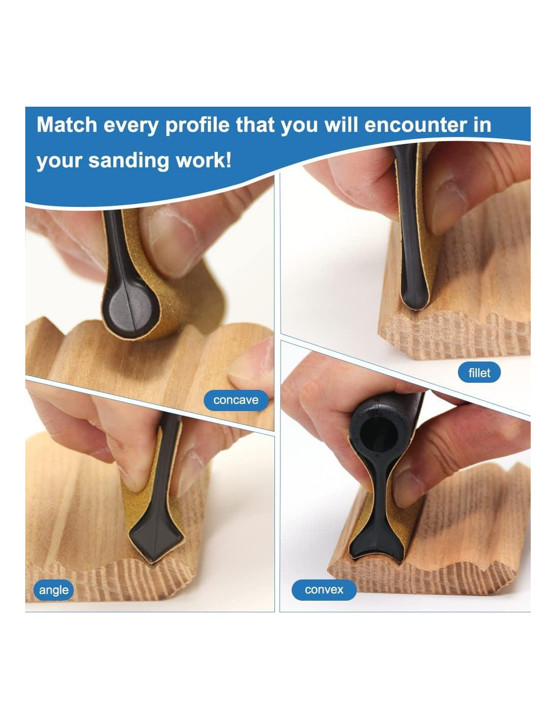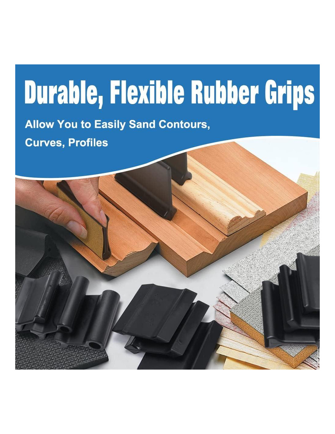 - CÓMODO: Cada agarre de lijado de contorno está hecho de goma flexible y antideslizante, con un perfil cóncavo y convexo en los extremos. El material de goma es lo suficientemente firme como para mantener bien su forma, pero lo suficientemente suave como para adaptarse a variaciones menores en el perfil. La textura antideslizante ayuda a prevenir que el abrasivo se deslice, lo que también reduce la necesidad de que aprietes.