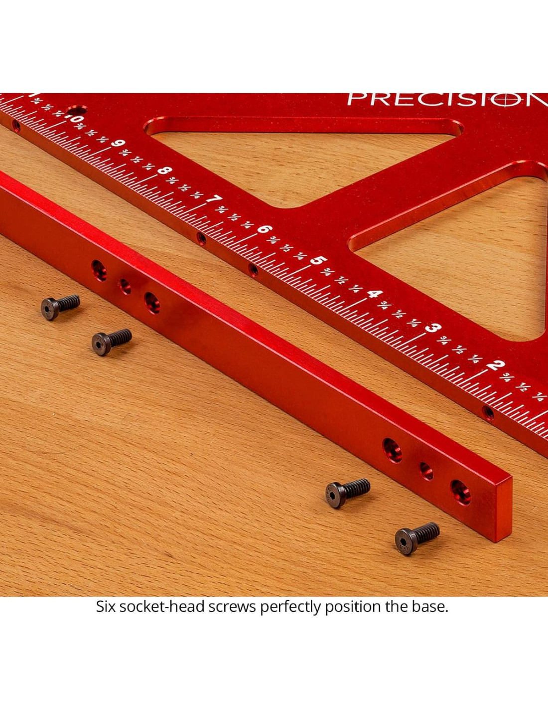 - BASE REMOVIBLE - Para situaciones donde se necesita una referencia sin hombro, como verificar el interior de un cajón para comprobar si está cuadrado o configurar el medidor de inglete en una sierra de mesa, la base se puede quitar fácilmente, permitiendo que el triángulo se coloque perfectamente plano.